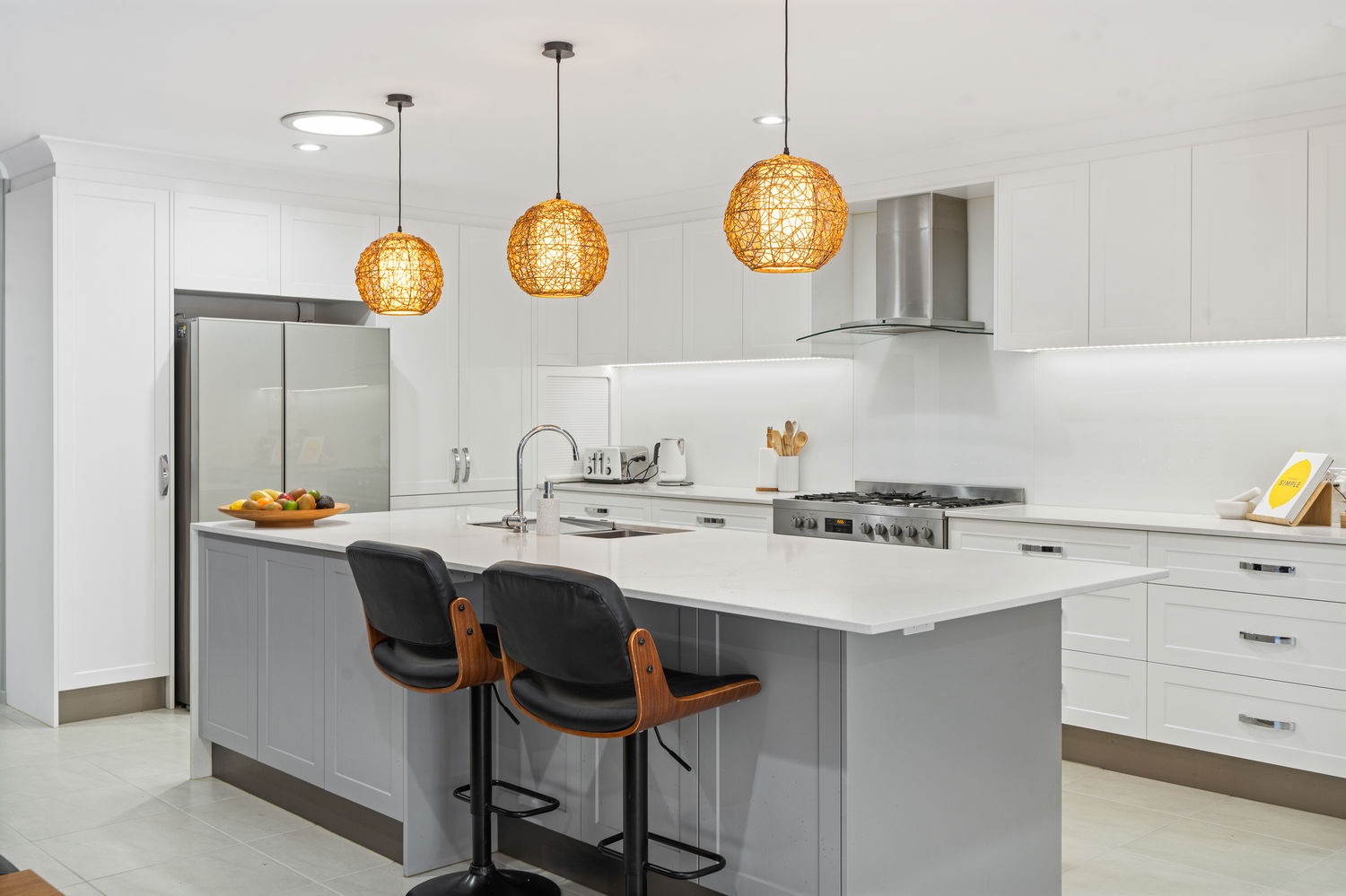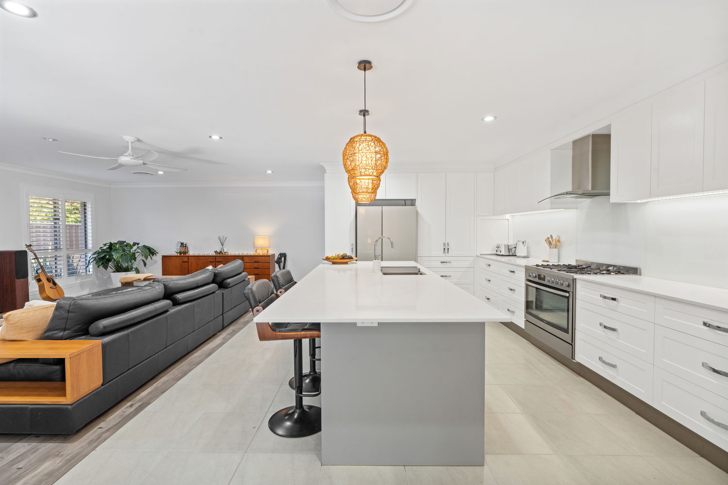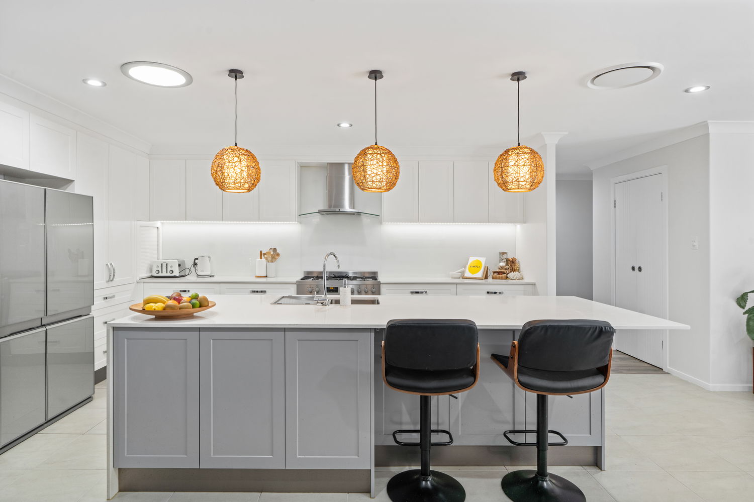 The gourmet kitchen forms the heart of the home, fitted with a Westinghouse 900mm five-burner gas stove and electric oven, Caesarstone benchtops, a family-friendly breakfast bar, soft-close drawers, under-cabinet lighting, an externally vented extractor fan, and a skylight that bathes the space in natural light.