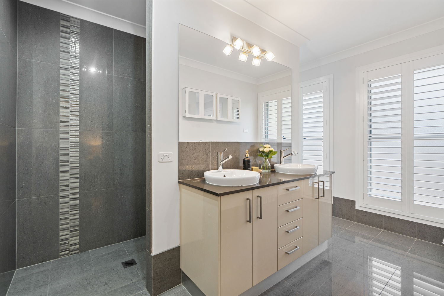 Generous open-plan living and dining zones flow seamlessly to the under-roof alfresco, creating an inviting hub for relaxed entertaining. The super-sized master retreat impresses with a fully fitted walk-in robe and luxurious ensuite, while three additional bedrooms feature built-in wardrobes, ceiling fans, and plush carpet. Designer bathrooms showcase Caesarstone benchtops, 2-pak vanities, and polished porcelain tiling for a refined finish.