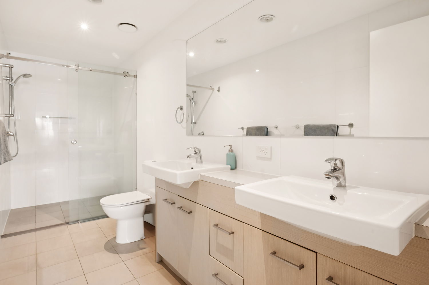 – En-suite featuring twin vanities, frameless glass shower, and floor-to-ceiling tiles