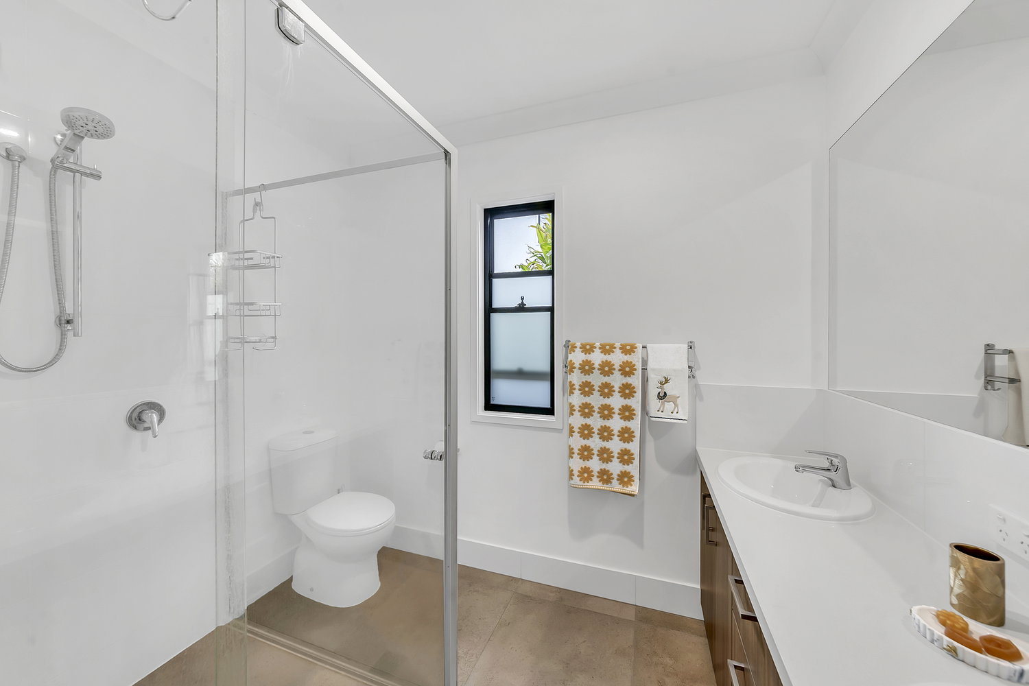 The thoughtfully designed layout includes air-conditioned open plan living, dining and kitchen spaces that flow seamlessly to the private outdoor patio — perfect for relaxed entertaining or unwinding at the end of the day. The kitchen is well appointed with generous bench and cupboard space, dishwasher, electric cooktop and oven.