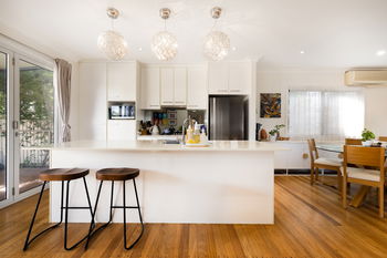 The stylish, renovated kitchen features an island bench, stone benchtops, and modern appliances, making it the heart of the home. The bathroom continues the contemporary feel with sleek, modern finishes. 2 bedrooms include built-in wardrobes, and the air-conditioned living space ensures year-round comfort.