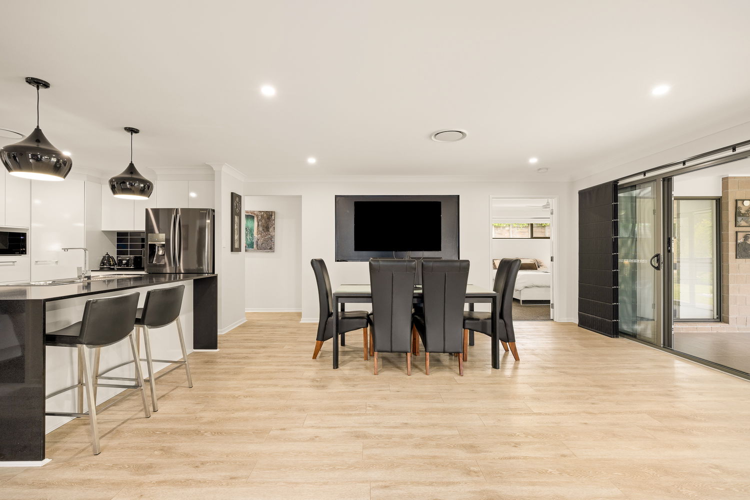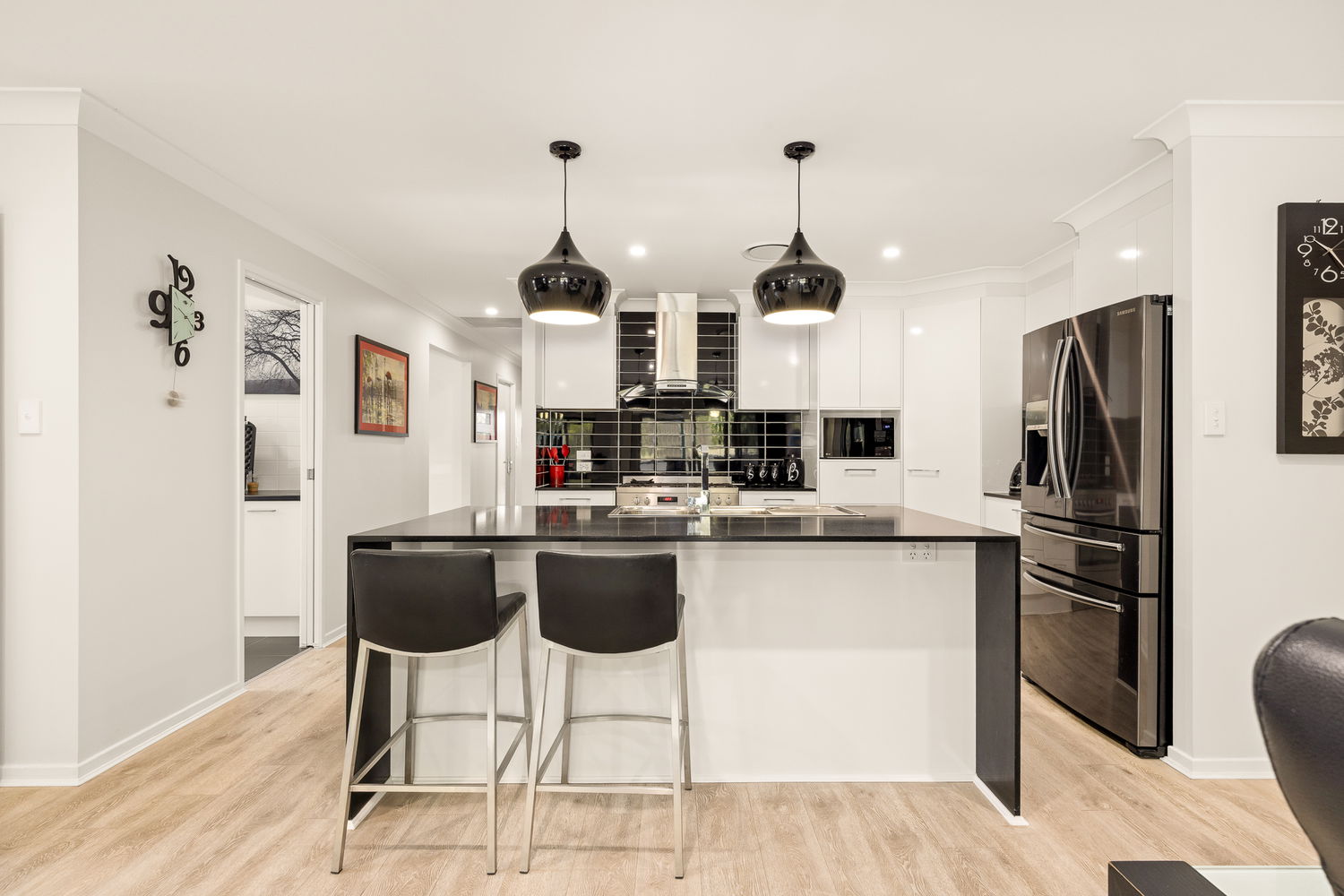 At the centre of the home, the open-plan living and dining area flows beautifully to the outdoors, drawing in natural light and the tranquil reserve outlook. The contemporary kitchen is as stylish as it is practical, featuring stone benchtops, great storage options, quality appliances, and an intuitive layout that suits everything from weekday meals to relaxed entertaining.