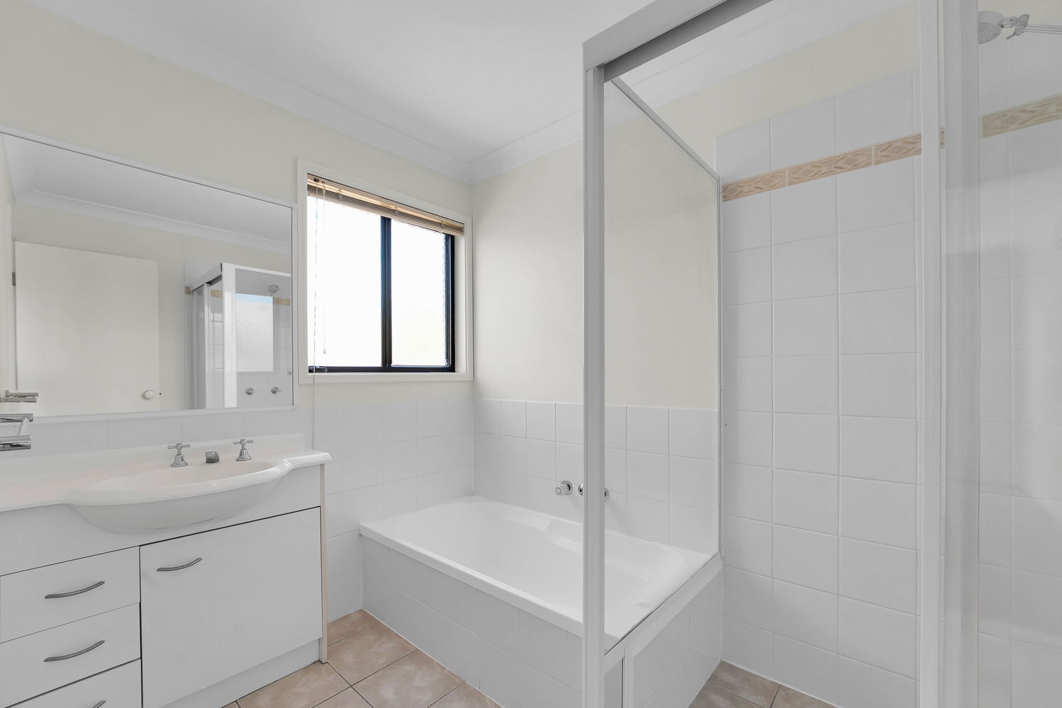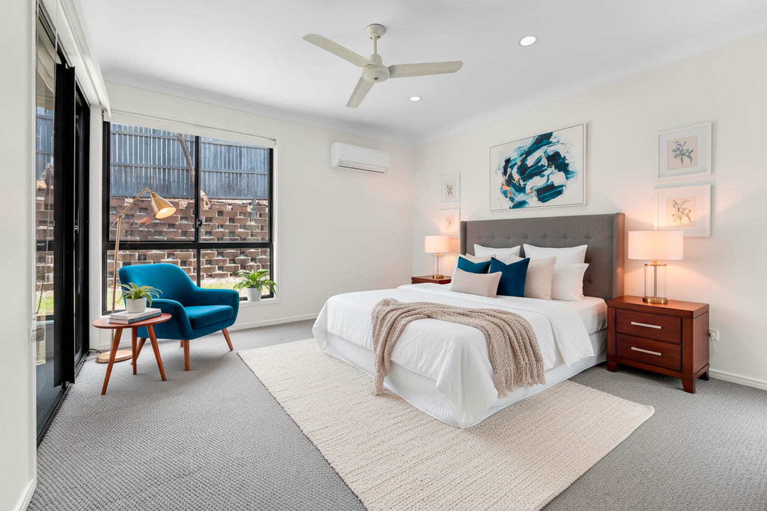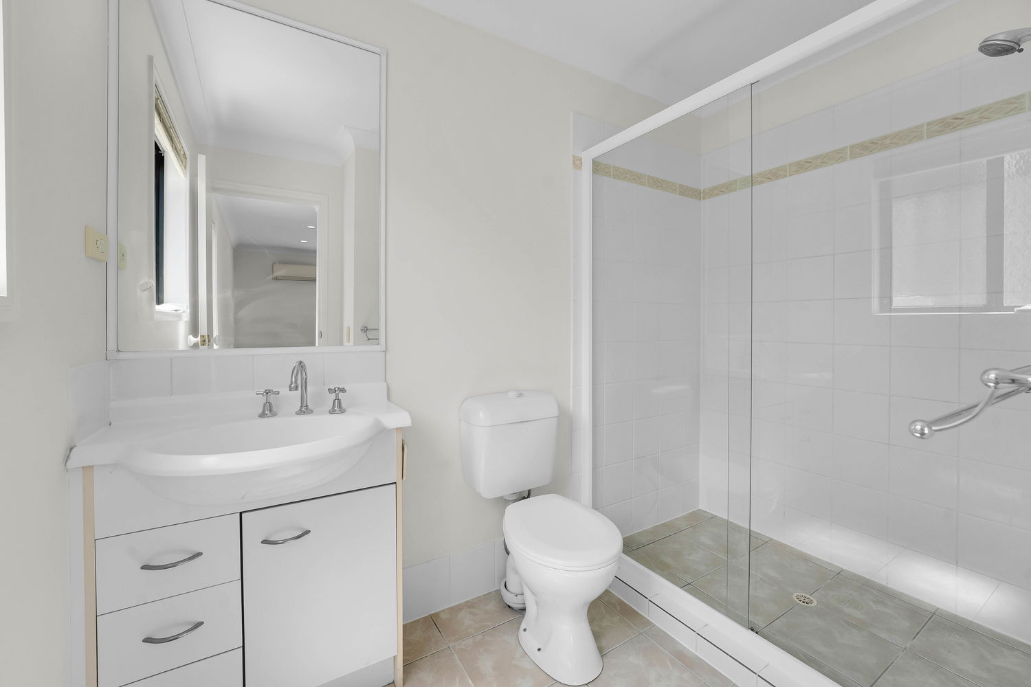 All three bedrooms feature ceiling fans. Bedrooms two and three include built-in wardrobes, while the master suite boasts a walk-in wardrobe, ensuite, air conditioning, and direct access to the rear patio. The main bathroom is thoughtfully designed with a separate shower and bathtub, catering perfectly to families.