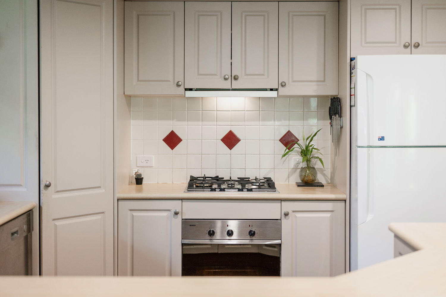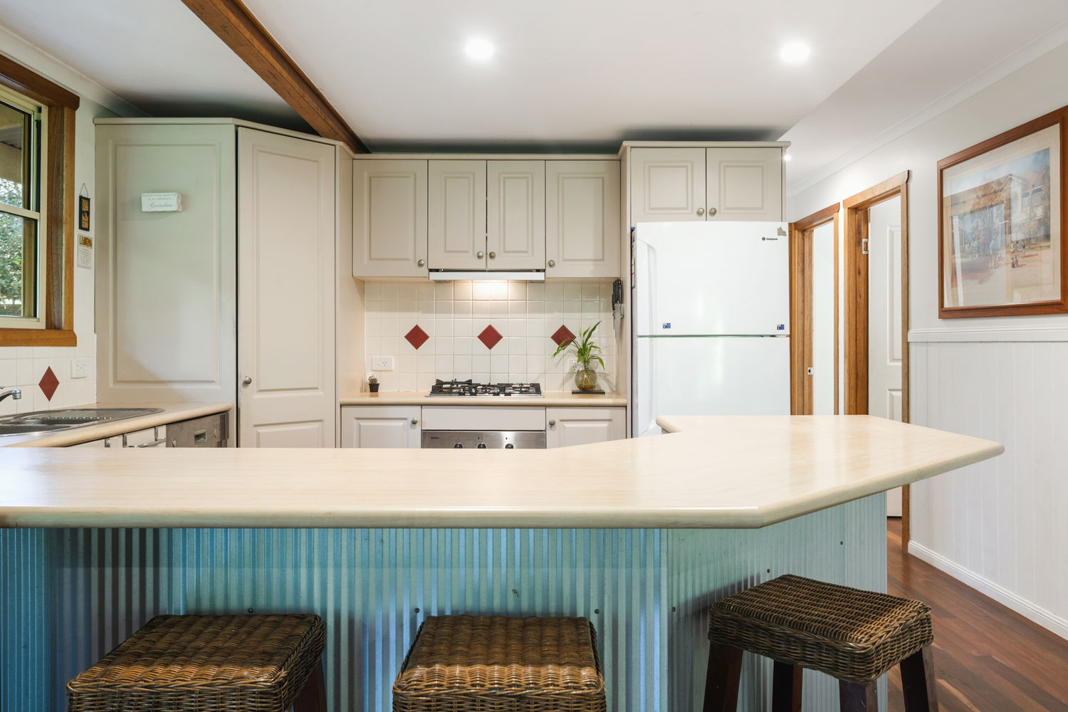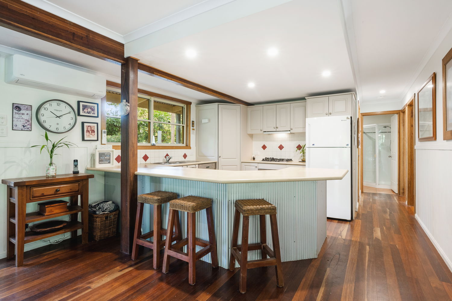 * First Level: Kitchen and open plan living, two double bedrooms, bathroom, and laundry. Beautiful blackbutt timber floors throughout.