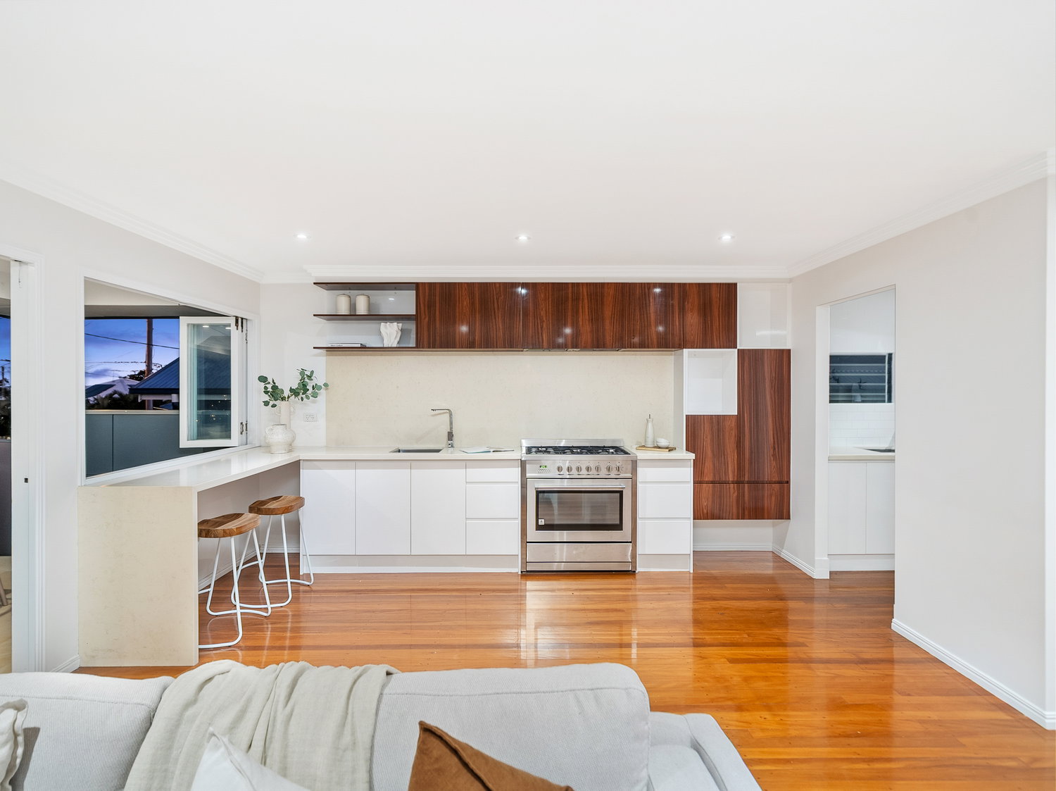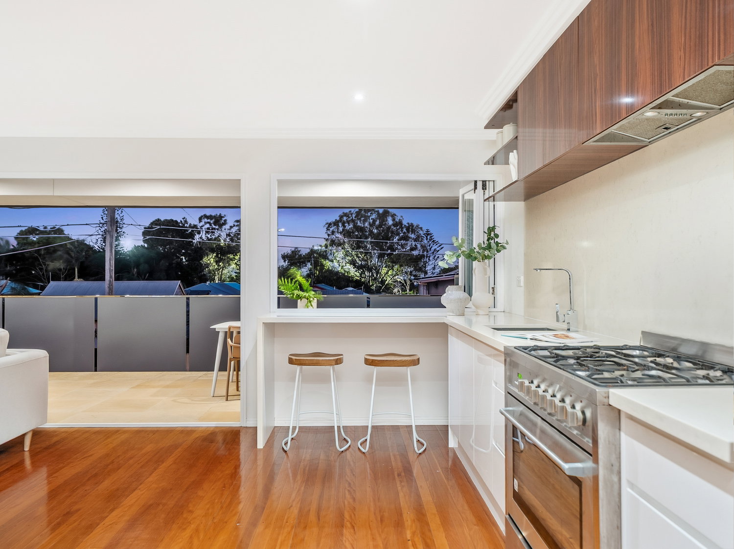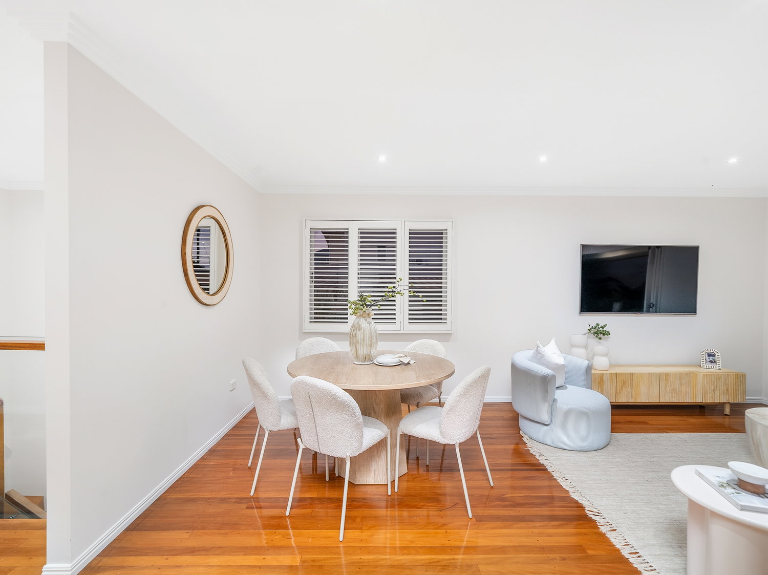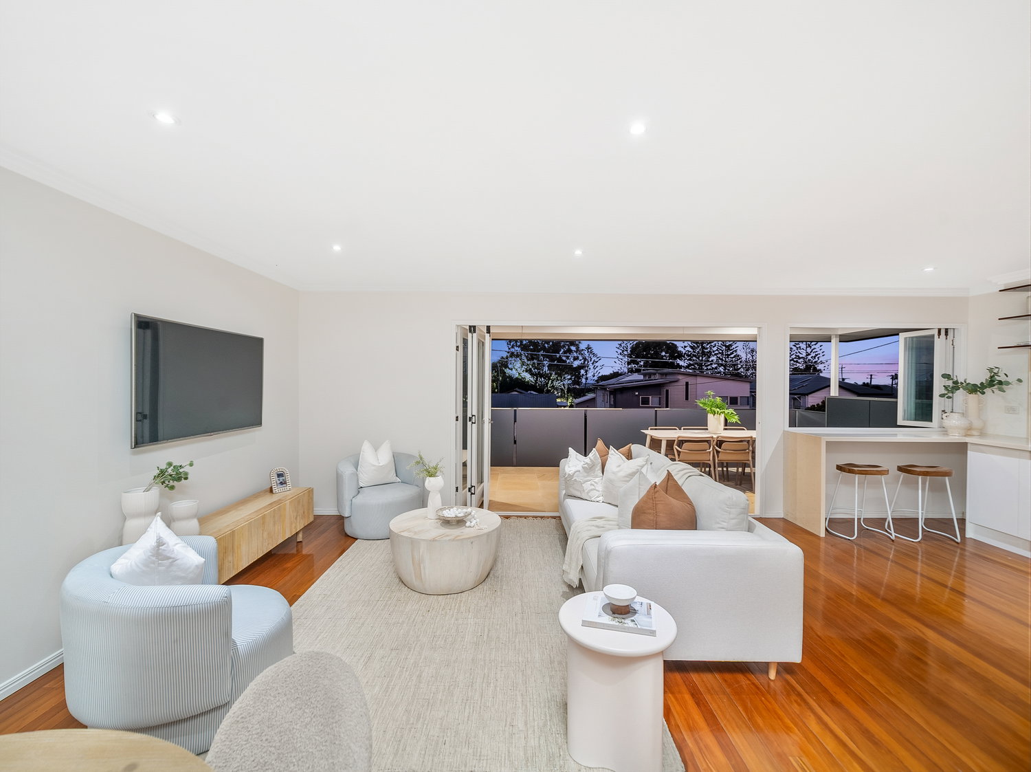 Set across two levels, the home immediately feels light, open and welcoming. Upstairs forms the heart of the home, where warm timber floors, soft neutral tones and an airy layout create a calm and inviting atmosphere. The open-plan living and dining zone flows seamlessly to the front balcony, capturing natural light and bay breezes while extending the living space outdoors.
