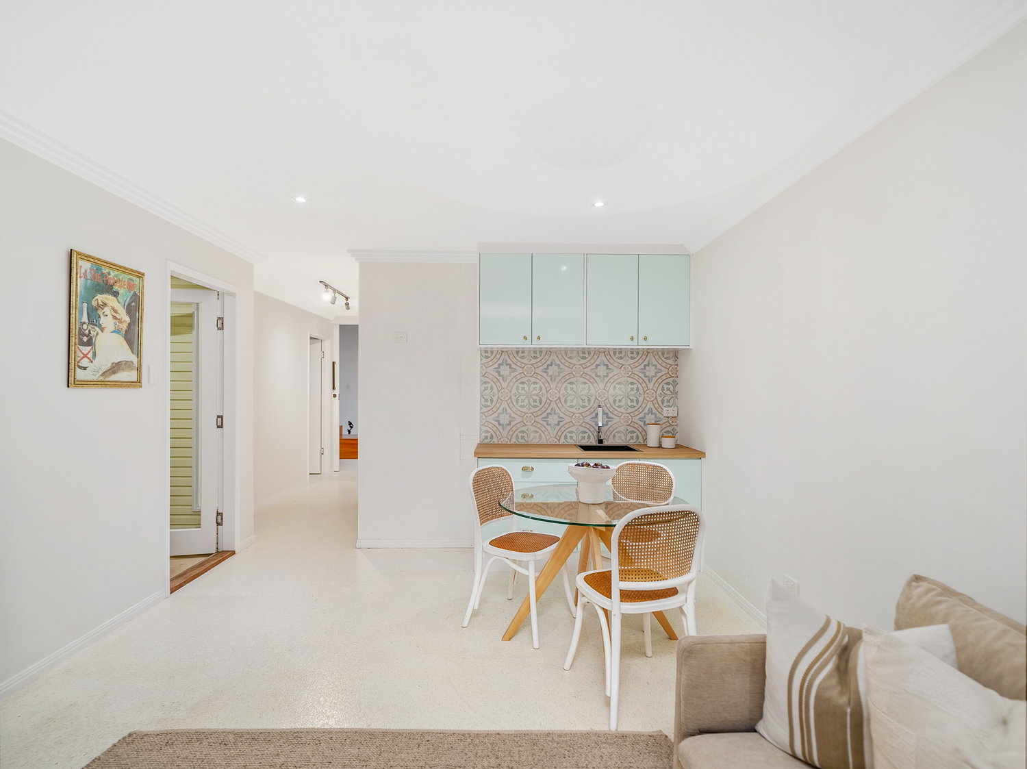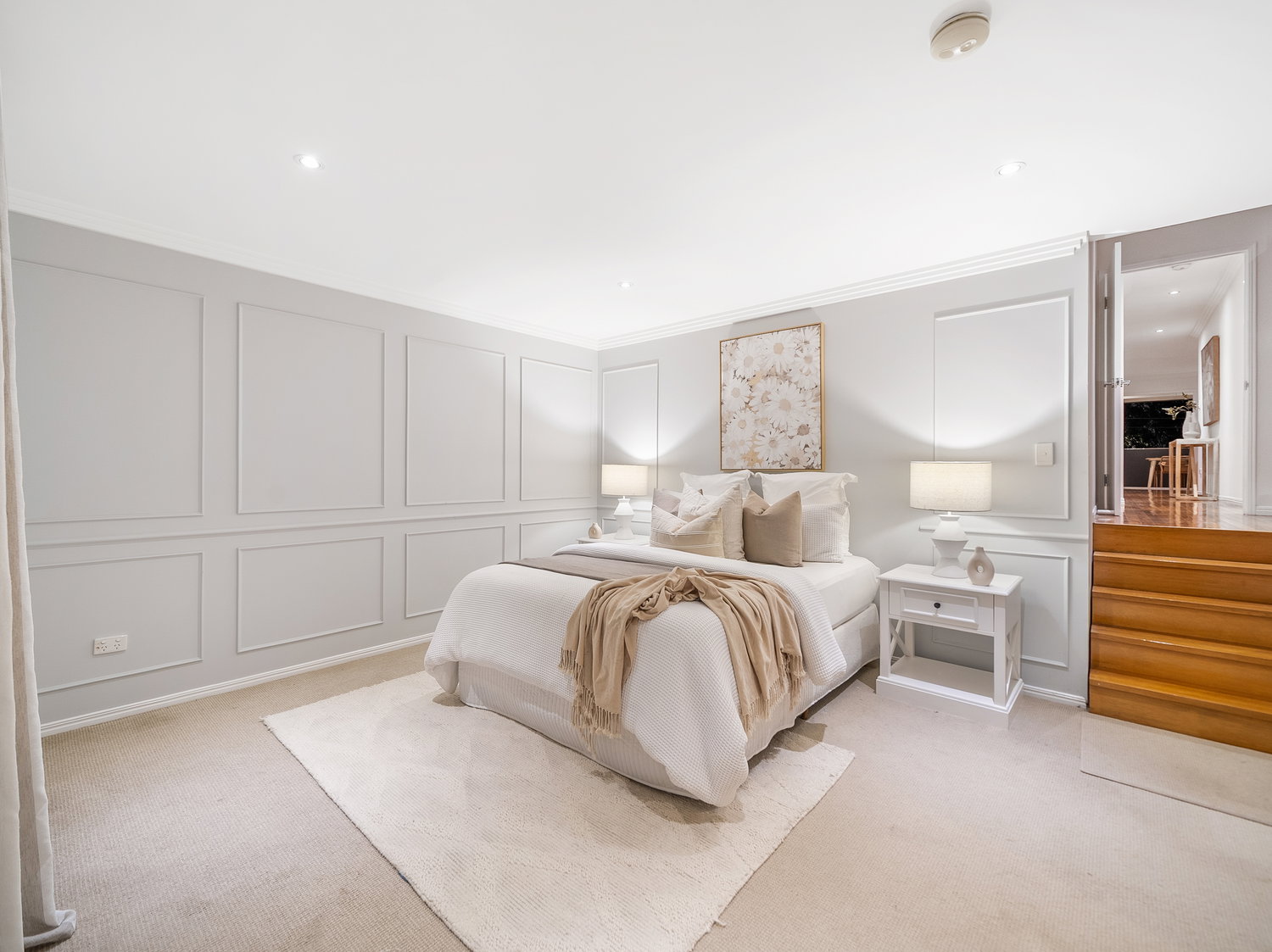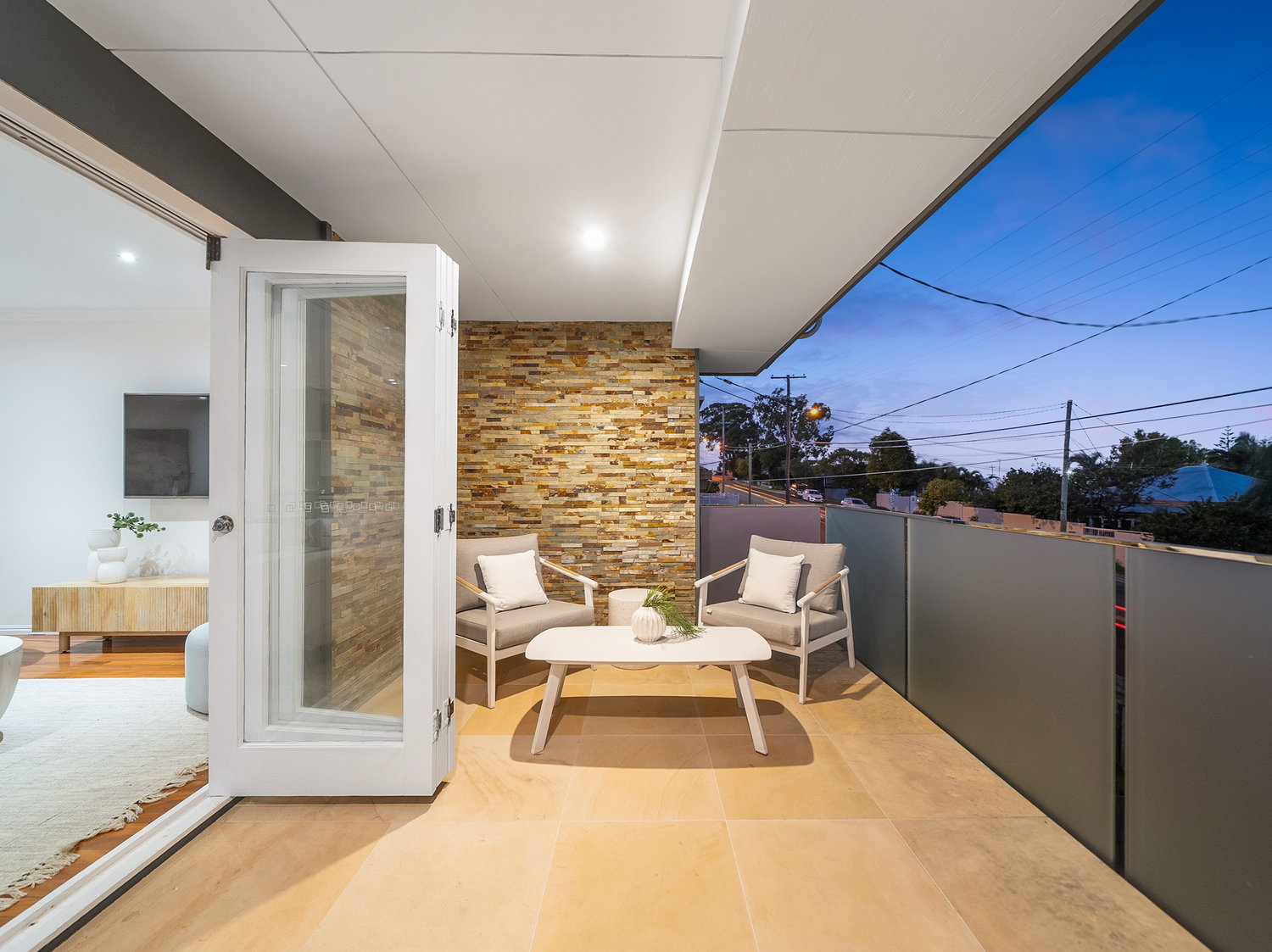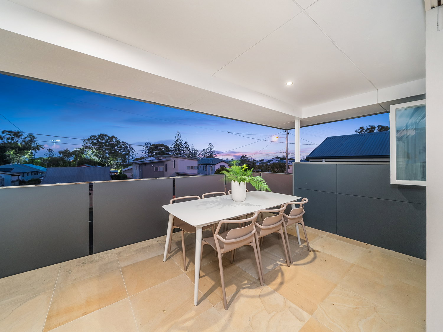 Set across two levels, the home immediately feels light, open and welcoming. Upstairs forms the heart of the home, where warm timber floors, soft neutral tones and an airy layout create a calm and inviting atmosphere. The open-plan living and dining zone flows seamlessly to the front balcony, capturing natural light and bay breezes while extending the living space outdoors.