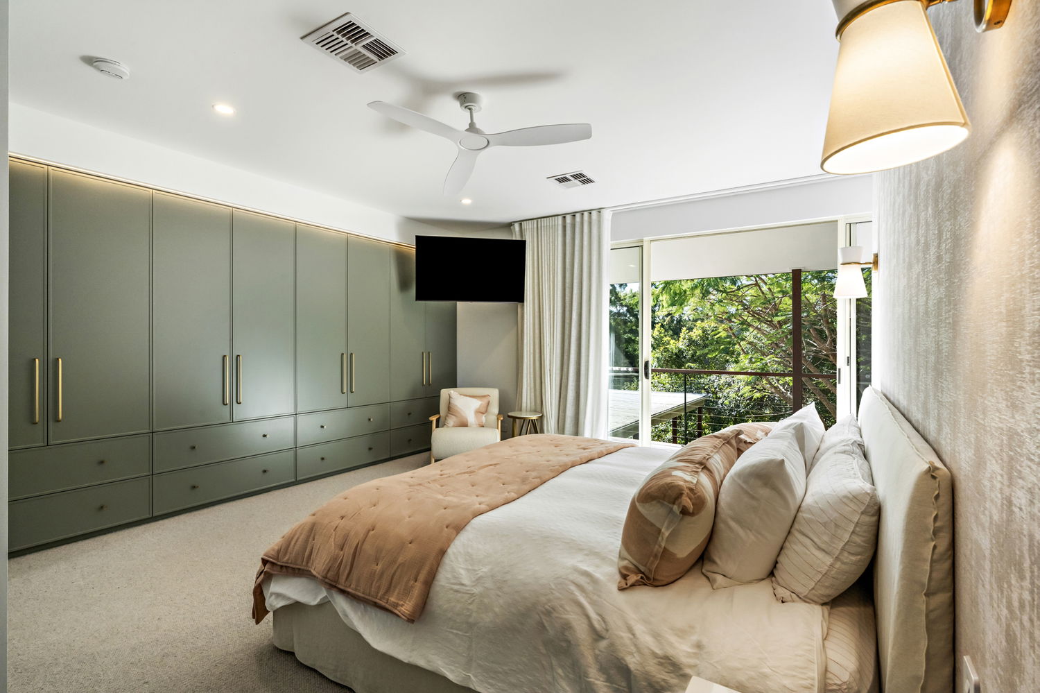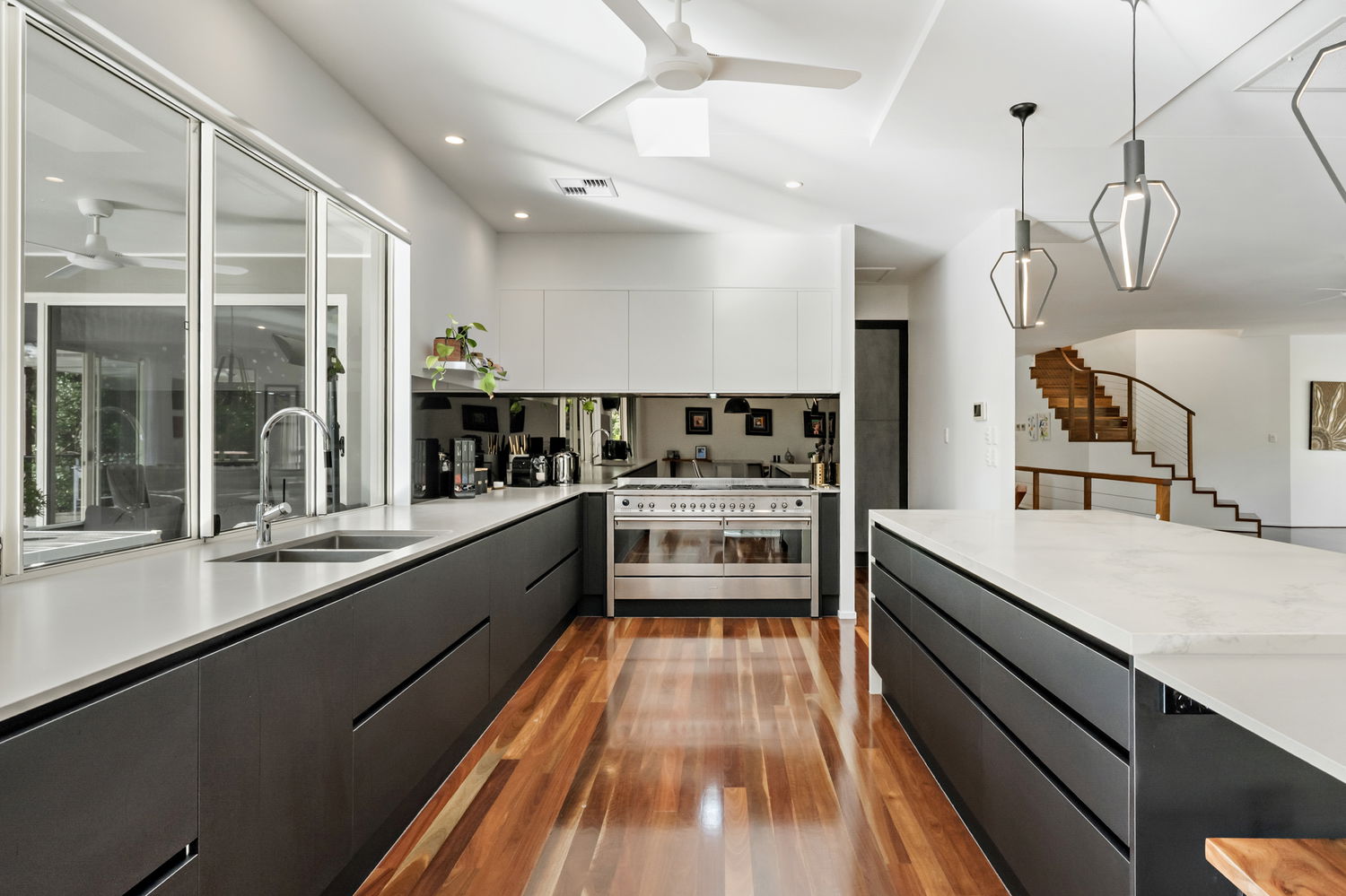 North-facing and overlooking the fairways of the golf course, the main residence is a study in elegance and functionality. A soaring entry with remote-controlled timber and glass doors opens to expansive living zones, spotted gum timber floors, and lush garden vistas from every angle. At its heart lies a gourmet kitchen with stone benchtops, state-of-the-art SMEG appliances, commercial gas cook top oven, and a walk-in pantry — all flowing seamlessly to a vast entertainer’s deck with bushland views.