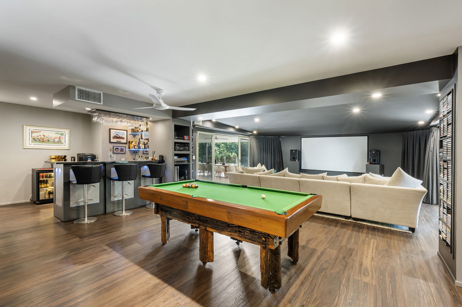 | Luxe media room with surround sound, wet bar (keg tap ready) and a cellar