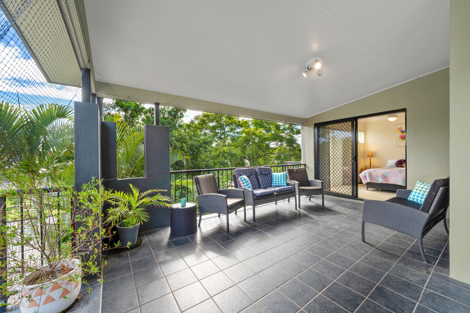 – Wrap-around North-West facing balcony fully enclosed with stainless steel mesh screening and custom blinds providing complete privacy and security