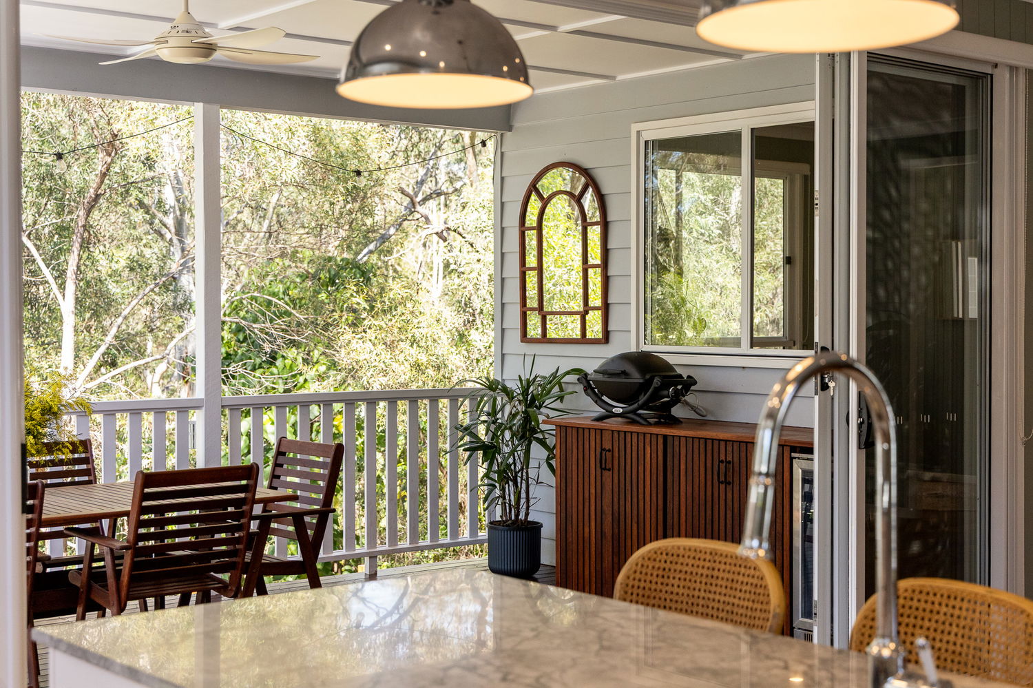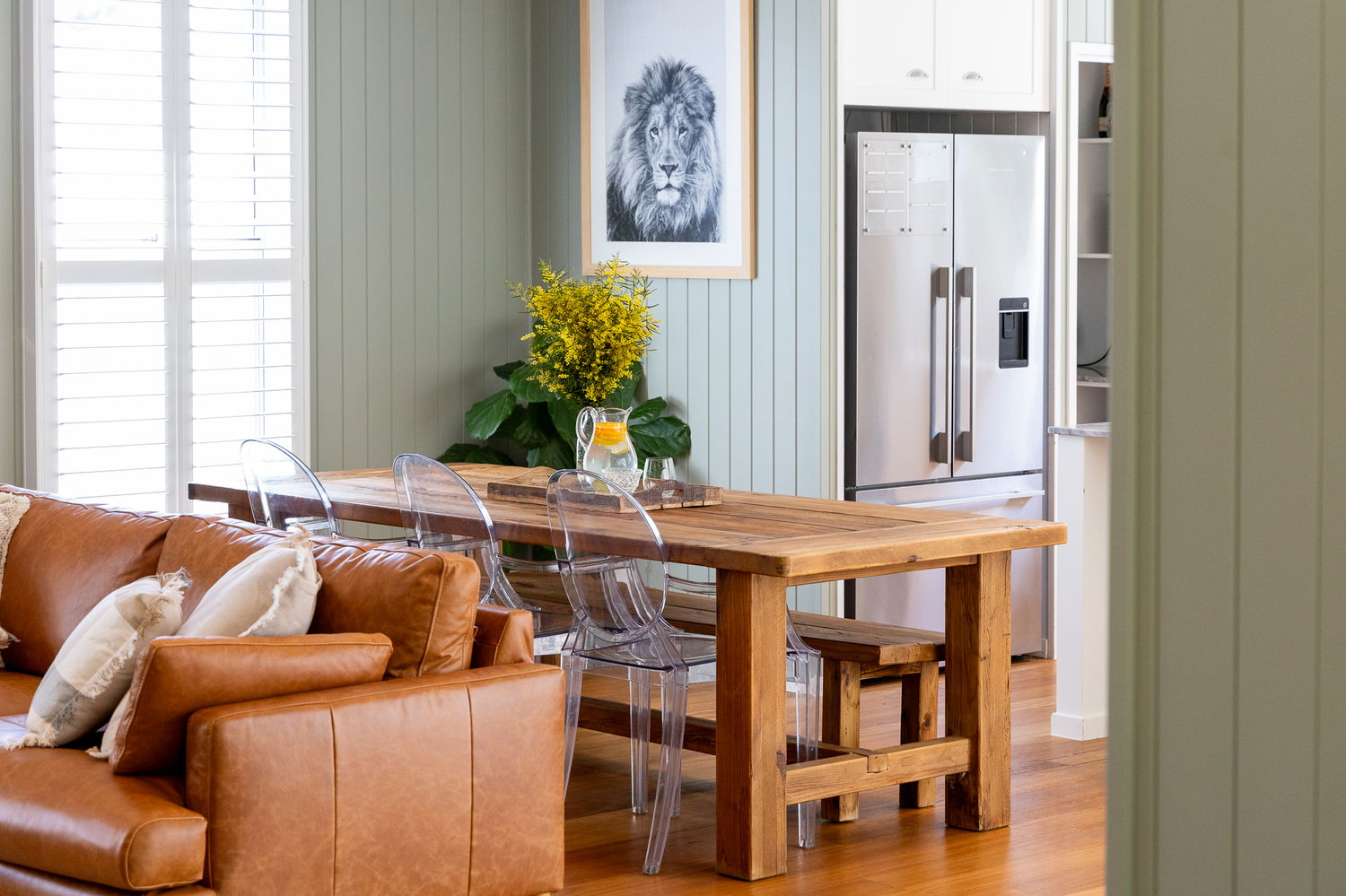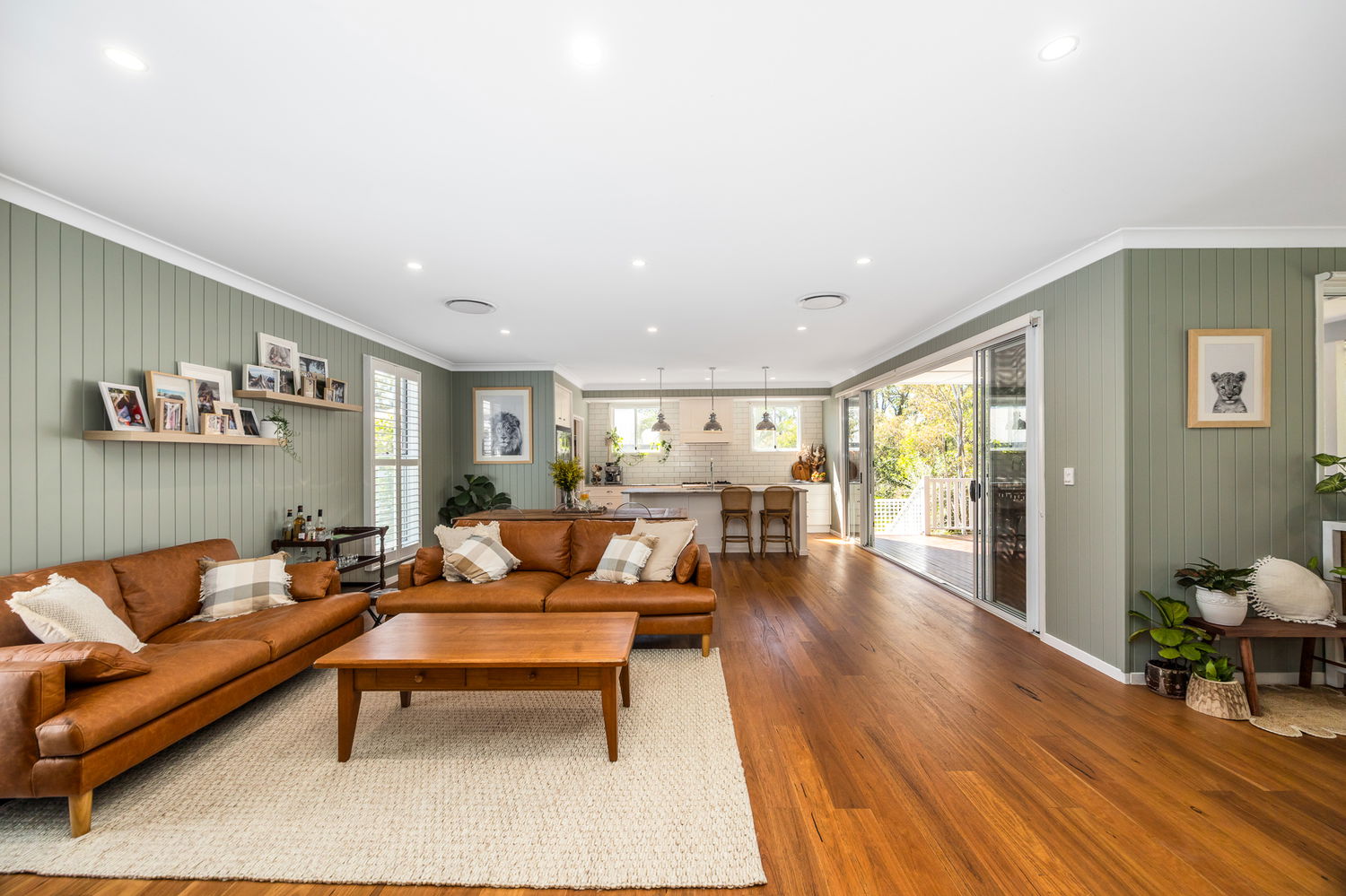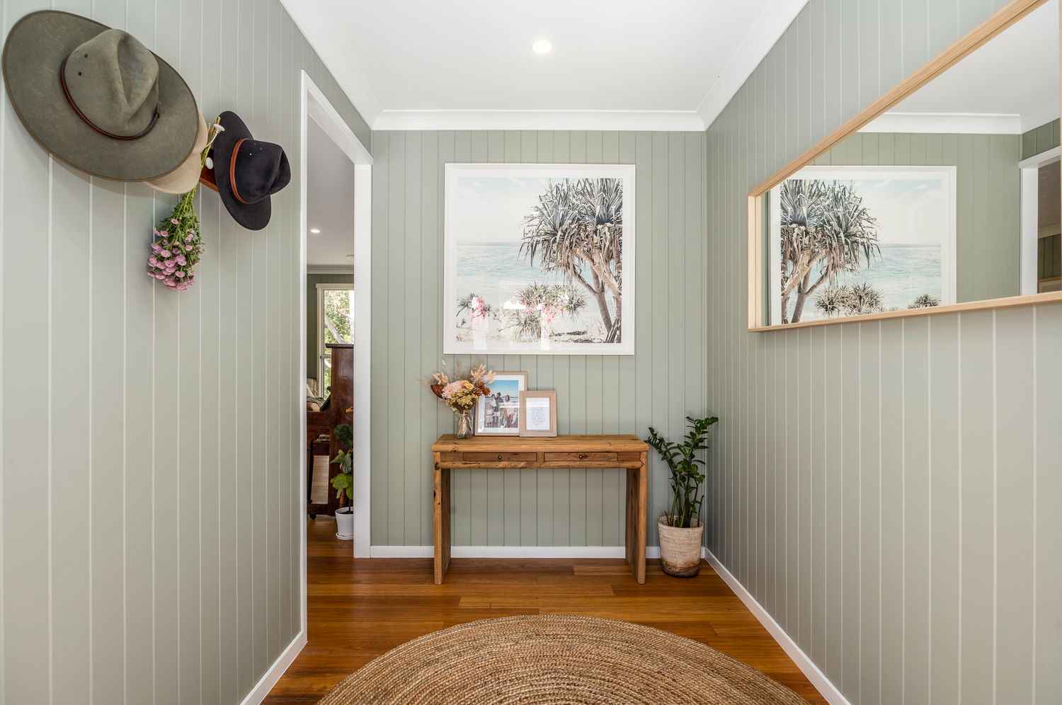 The ground floor has been designed for effortless everyday living and entertaining. Beautiful Black Butt timber floors flow throughout the ground level, perfectly complemented by VJ paneled walls that add texture, warmth, and timeless character to the space. The combination of natural materials and soft, neutral tones creates a calm and inviting atmosphere that feels both fresh and refined. High ceilings and large windows allow natural light to flood the interior, enhancing the airy, coastal feel.
