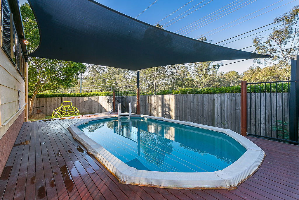 Fully fenced above ground saltwater swimming pool with waterproof shade sail — ideal for Queensland summers.