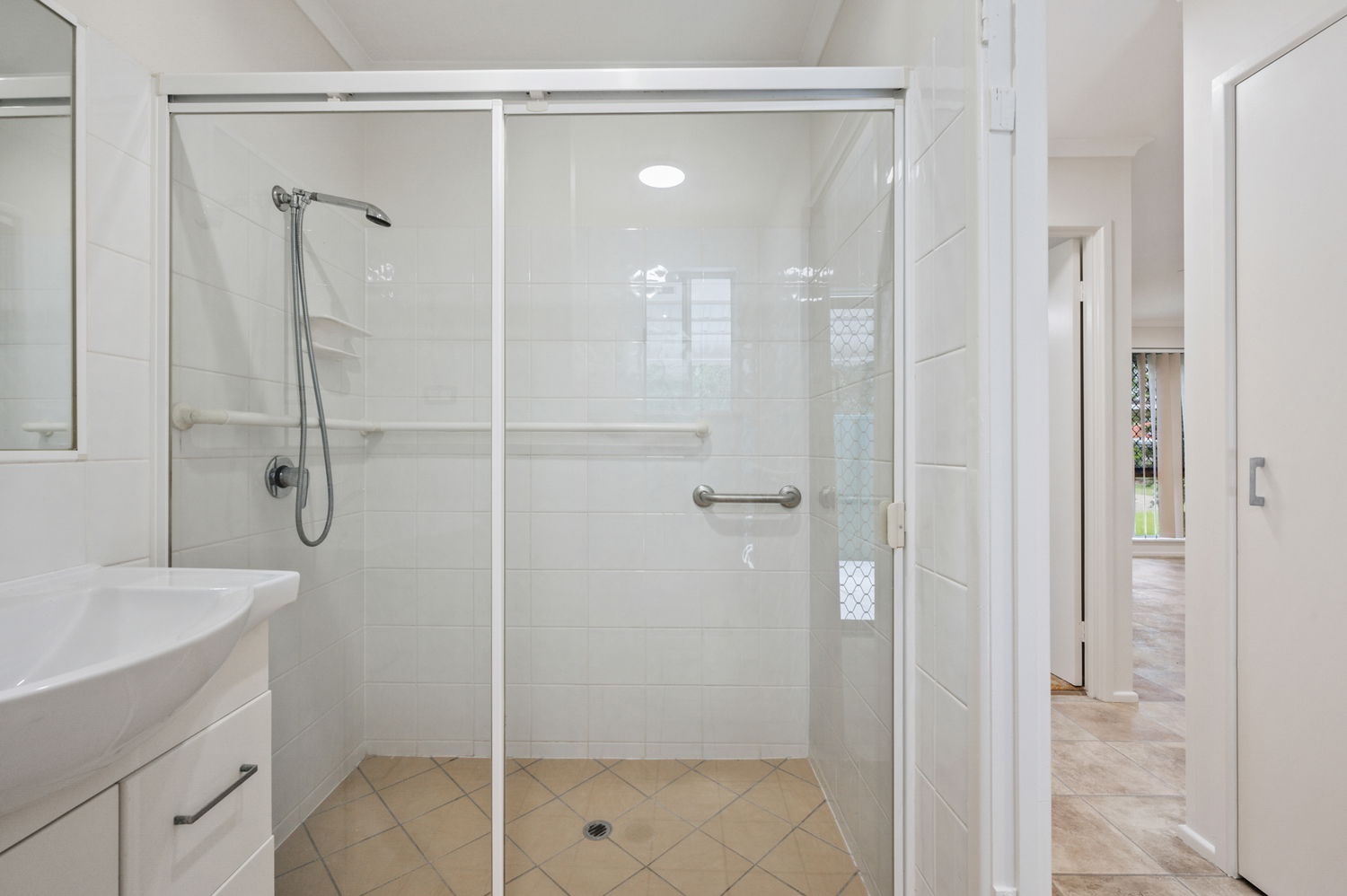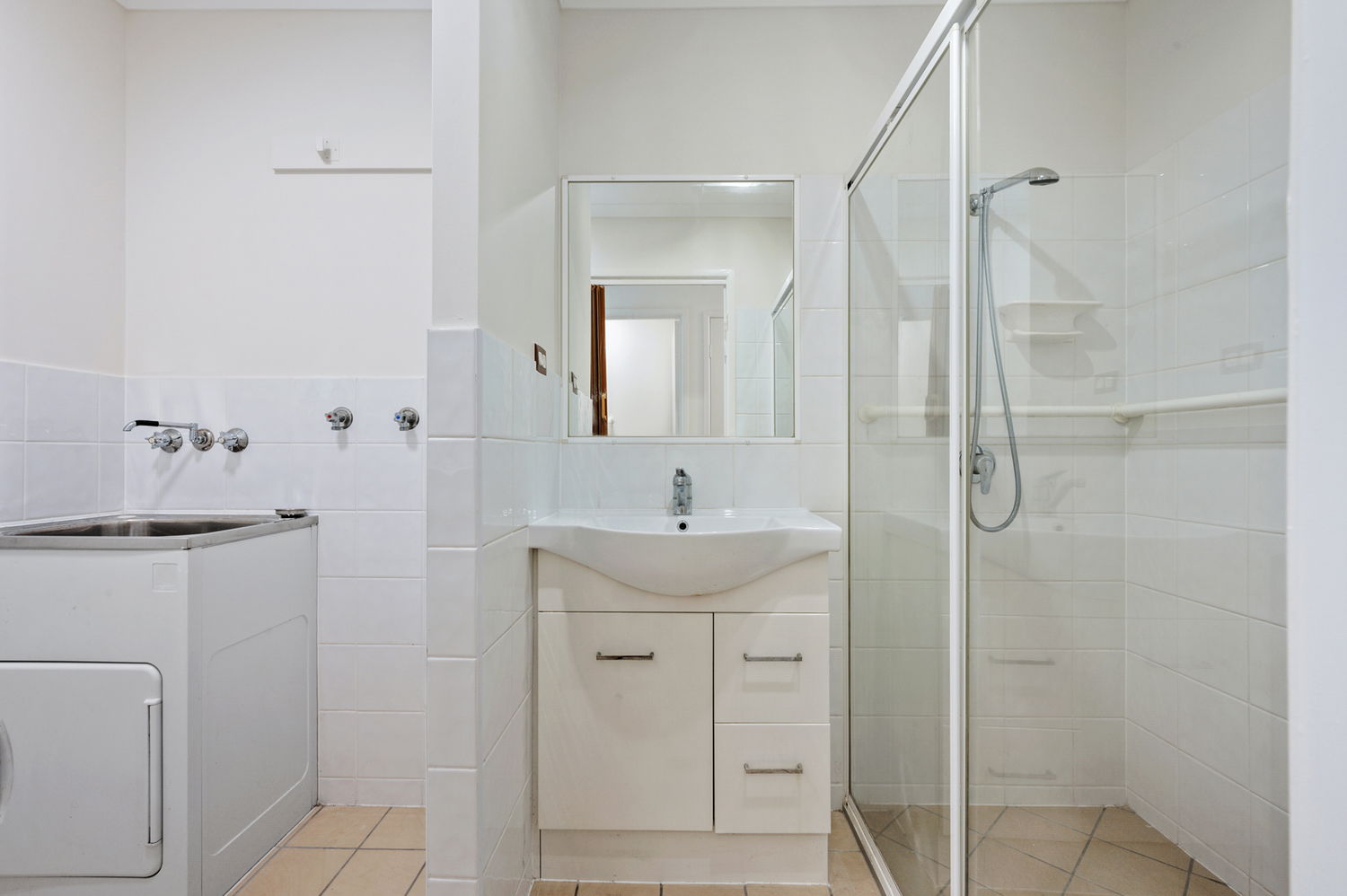 Tidy bathroom with combined shower and laundry