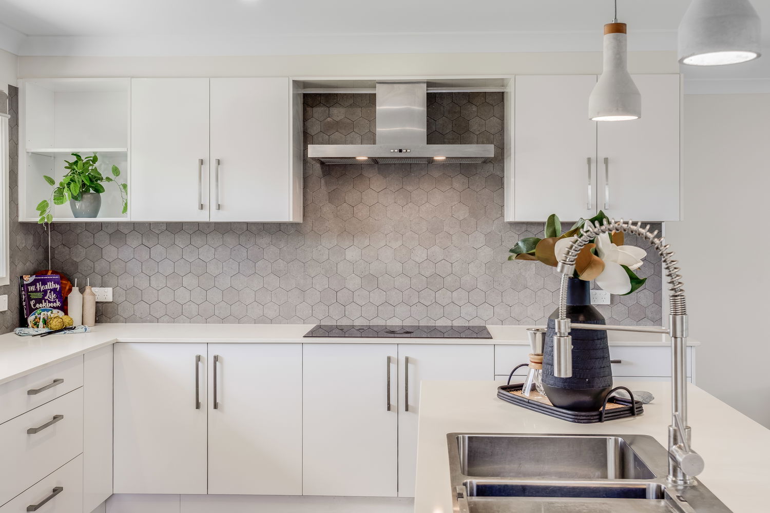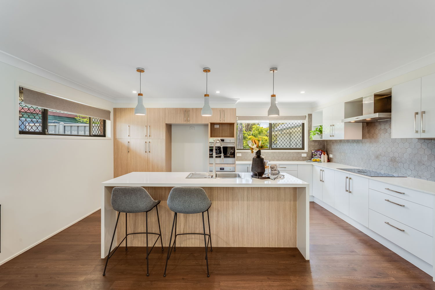 The adjacent kitchen, with a host of quality appliances and plenty of cupboard and pantry space, comes with a contemporary double-sink and laminated surfaces.