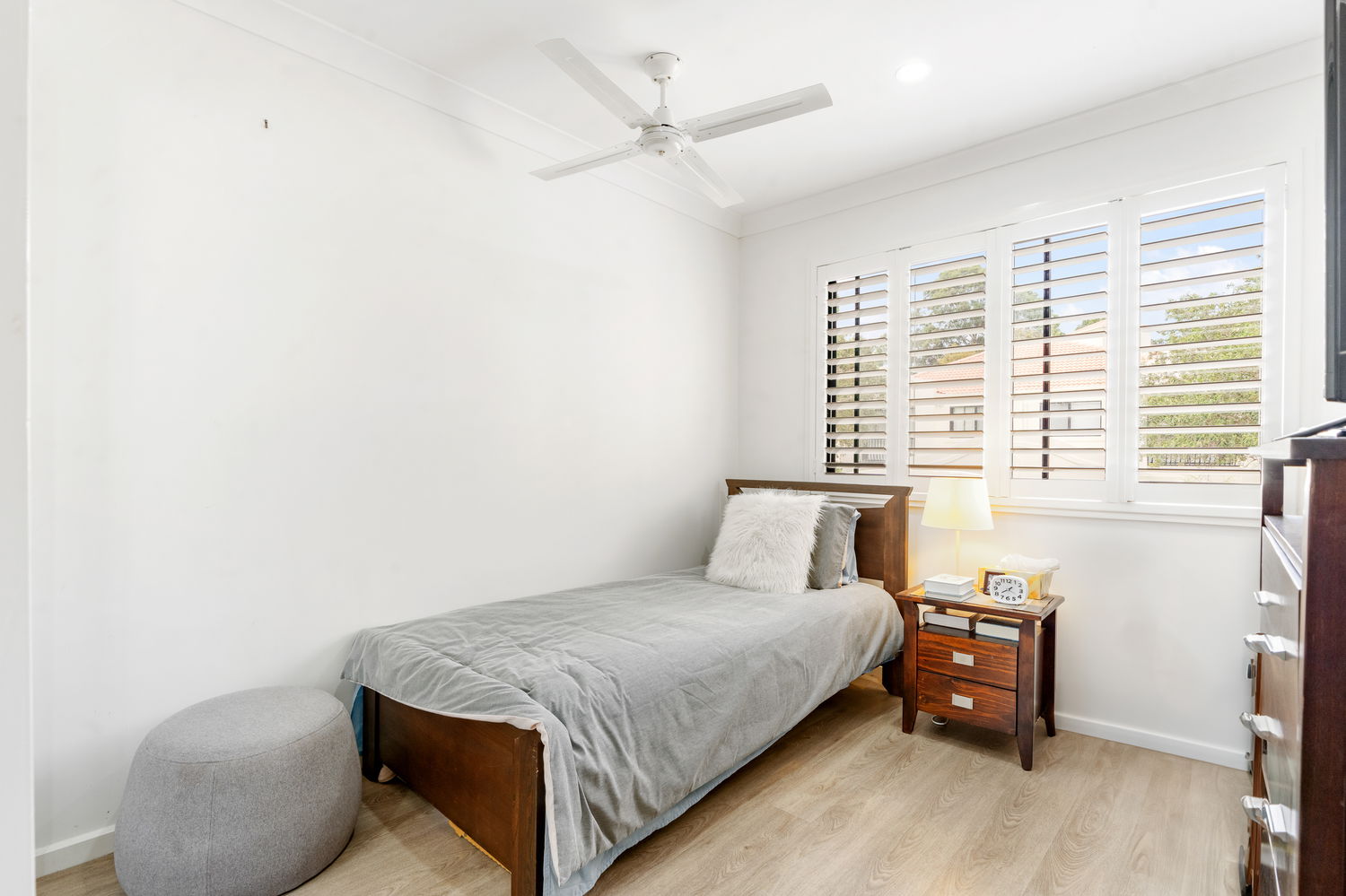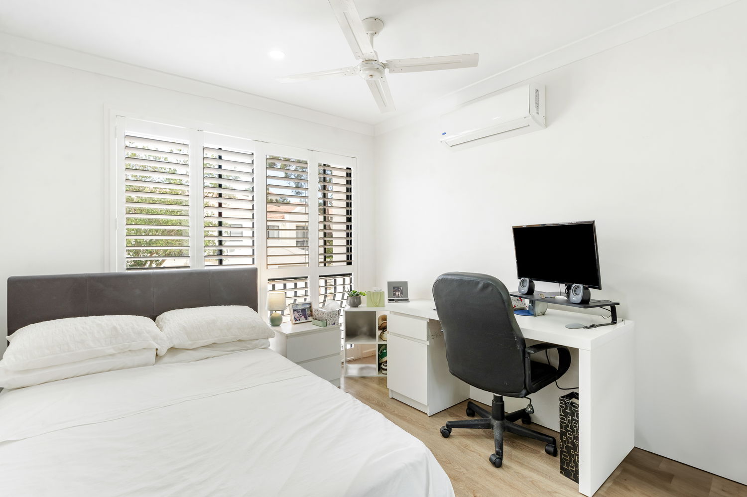 – Two additional bedrooms with built-in wardrobes, shutters and ceiling fans (air conditioning to one)