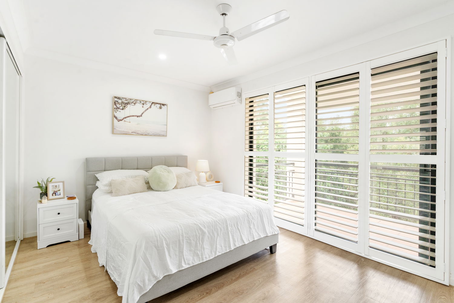 – Master bedroom featuring private balcony, shutters, air conditioning, ceiling fan, built-in robe and large ensuite