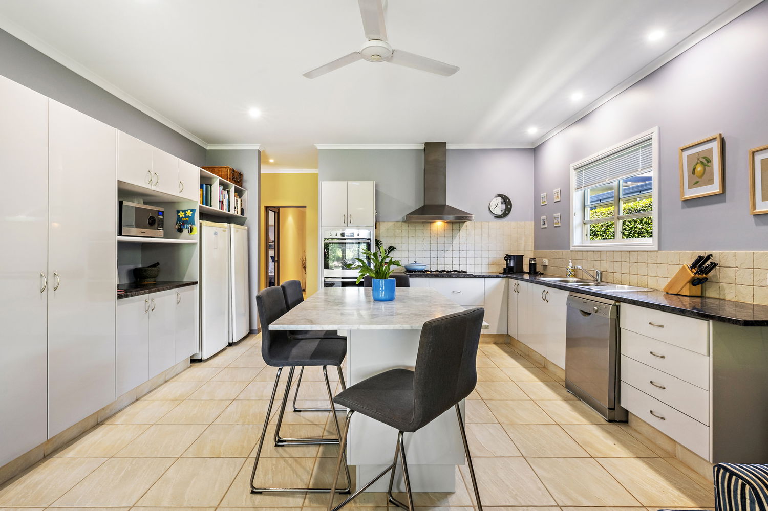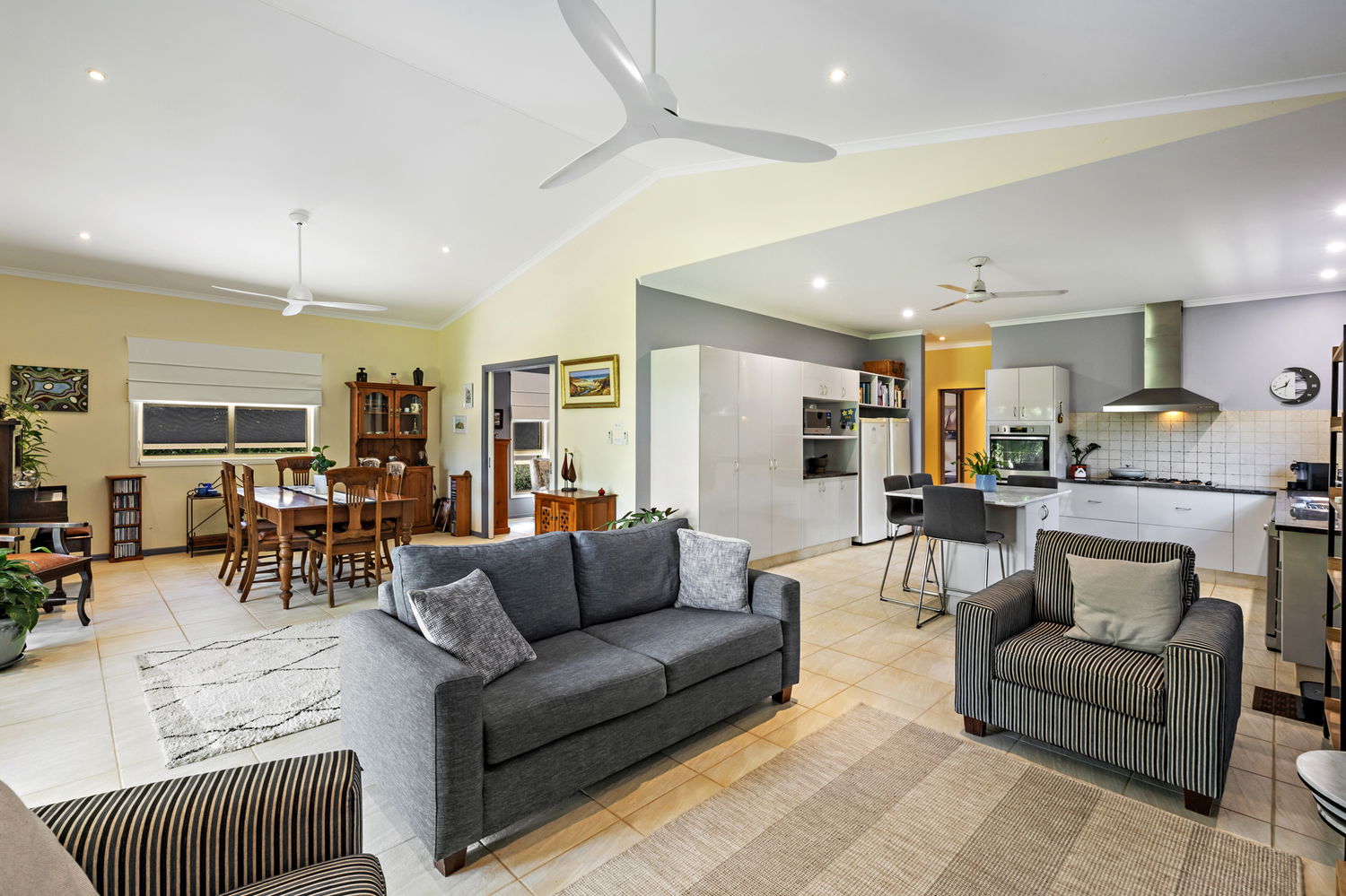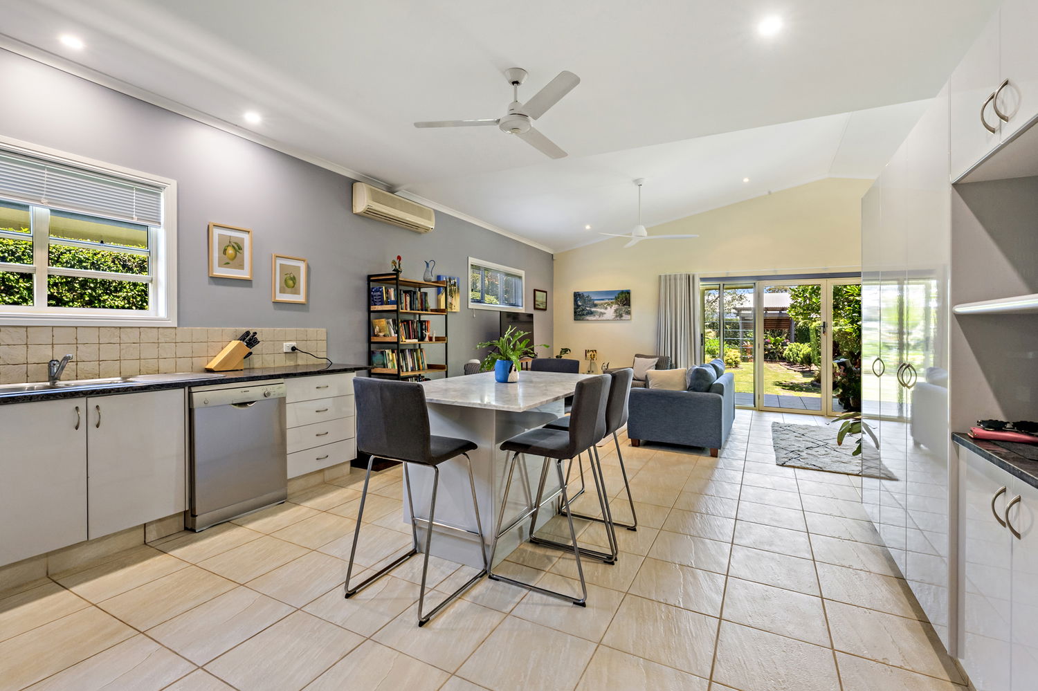Occupying a generous 759m² allotment, the home is surrounded by impeccably manicured gardens, creating a private and picturesque setting that is both welcoming and serene. The heart of the home is the expansive kitchen and living domain, where soaring pitched ceilings enhance the sense of volume and natural light. While large windows frame calming garden views, delivering a seamless connection between indoors and out.