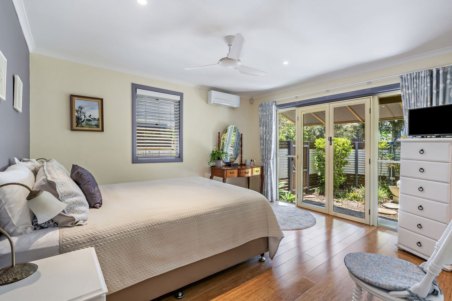 The master suite is privately positioned at the front of the residence and features its own secluded courtyard, providing a peaceful retreat away from the main living areas. Three additional bedrooms and a well-appointed second bathroom offer superb accommodation for families or guests, all designed with comfort and space in mind.