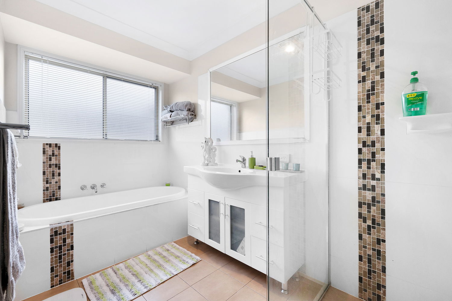 – Modern family bathroom with stainless steel fittings, separate bath and shower