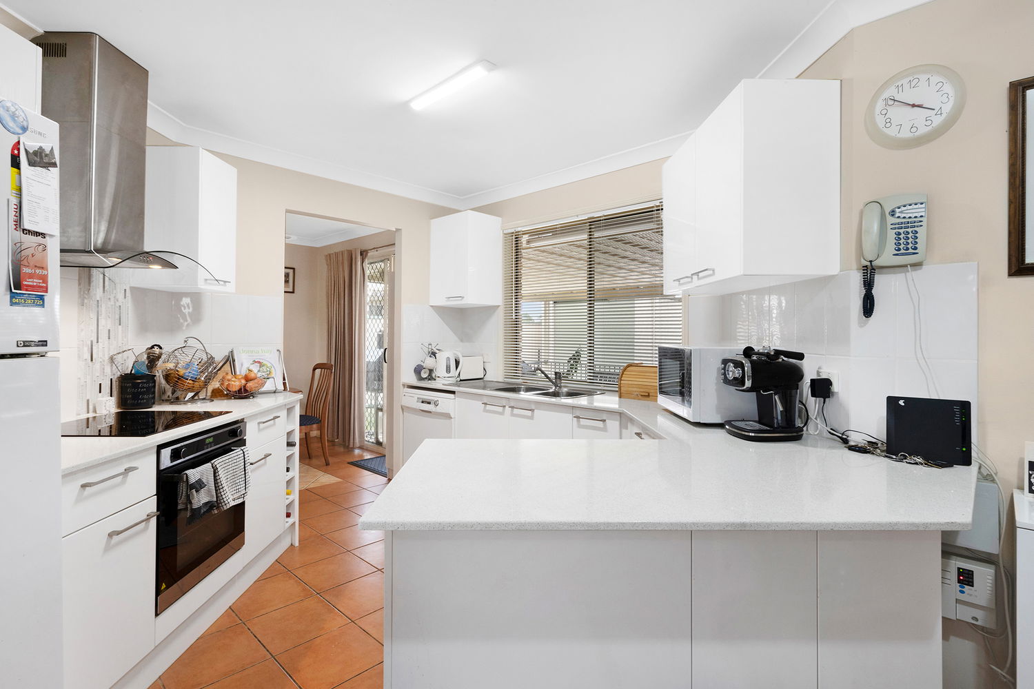 – Well-designed and modern kitchen with breakfast bar, stone benchtop, ample storage space, stainless steel fixtures including a double sink, dishwasher and electric cooktop