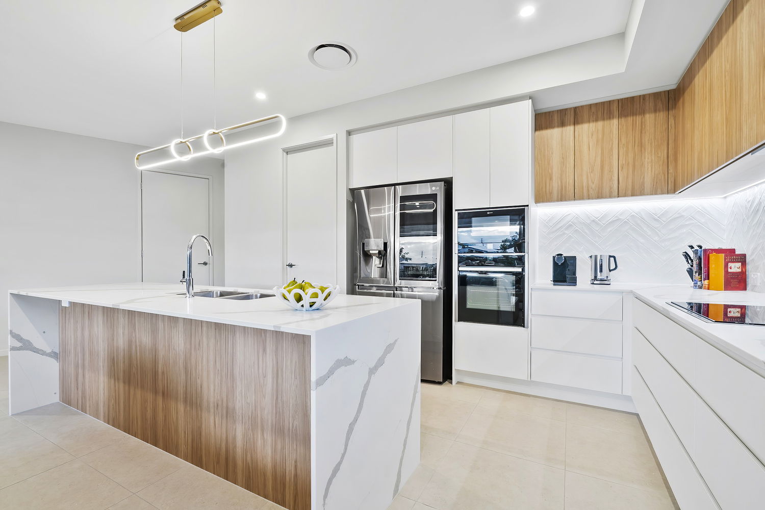 • Large prestige kitchen stone benchtops, premium appliances, soft close cabinetry