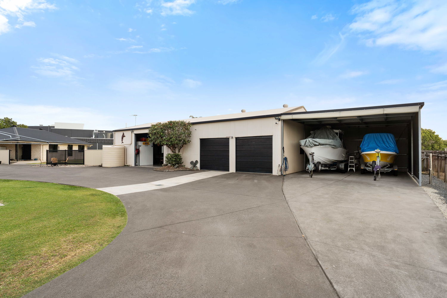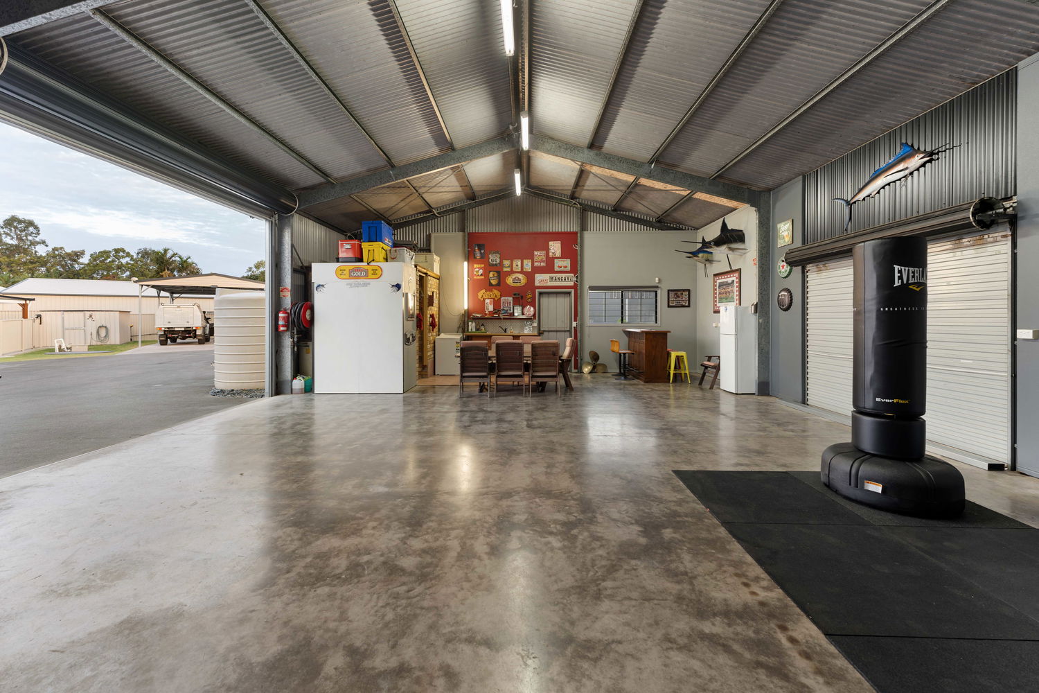 For those who need serious workspace or storage, the shed is a standout feature. Constructed with a heavy-duty structural frame and polished concrete throughout, it spans an impressive 27m x 9m with a 3.8m clearance in the highest bay. Divided into three separate lockable bays, it includes a kitchen/laundry/man cave area, toilet, shower, hot water, three-phase power, dozens of 10 and 15-amp circuits, and an electric roller door. With over 600sqm of driveway space and capacity for 15 cars under cover, this property caters to trades, hobbyists, and those needing secure storage.