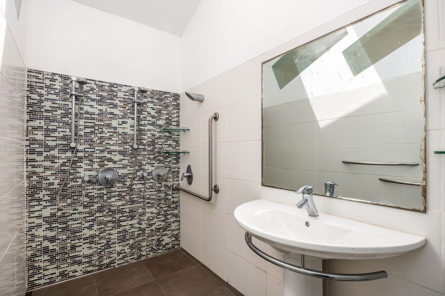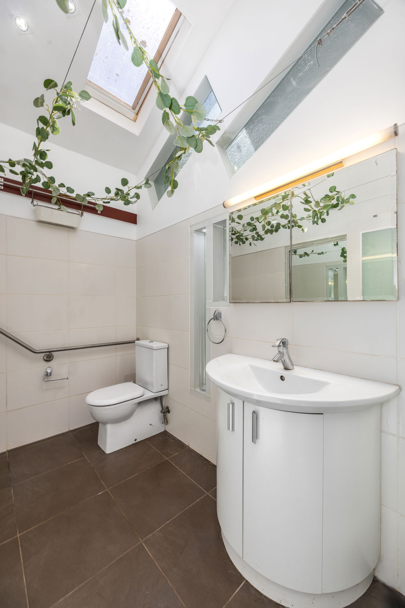 The practical bathroom boasts a large walk-in shower, providing easy access and plenty of space for comfortable daily use. A separate toilet adds to the convenience, making the layout ideal for family living or when guests are visiting. Designed with everyday functionality in mind, this bathroom is both spacious and easy to maintain.