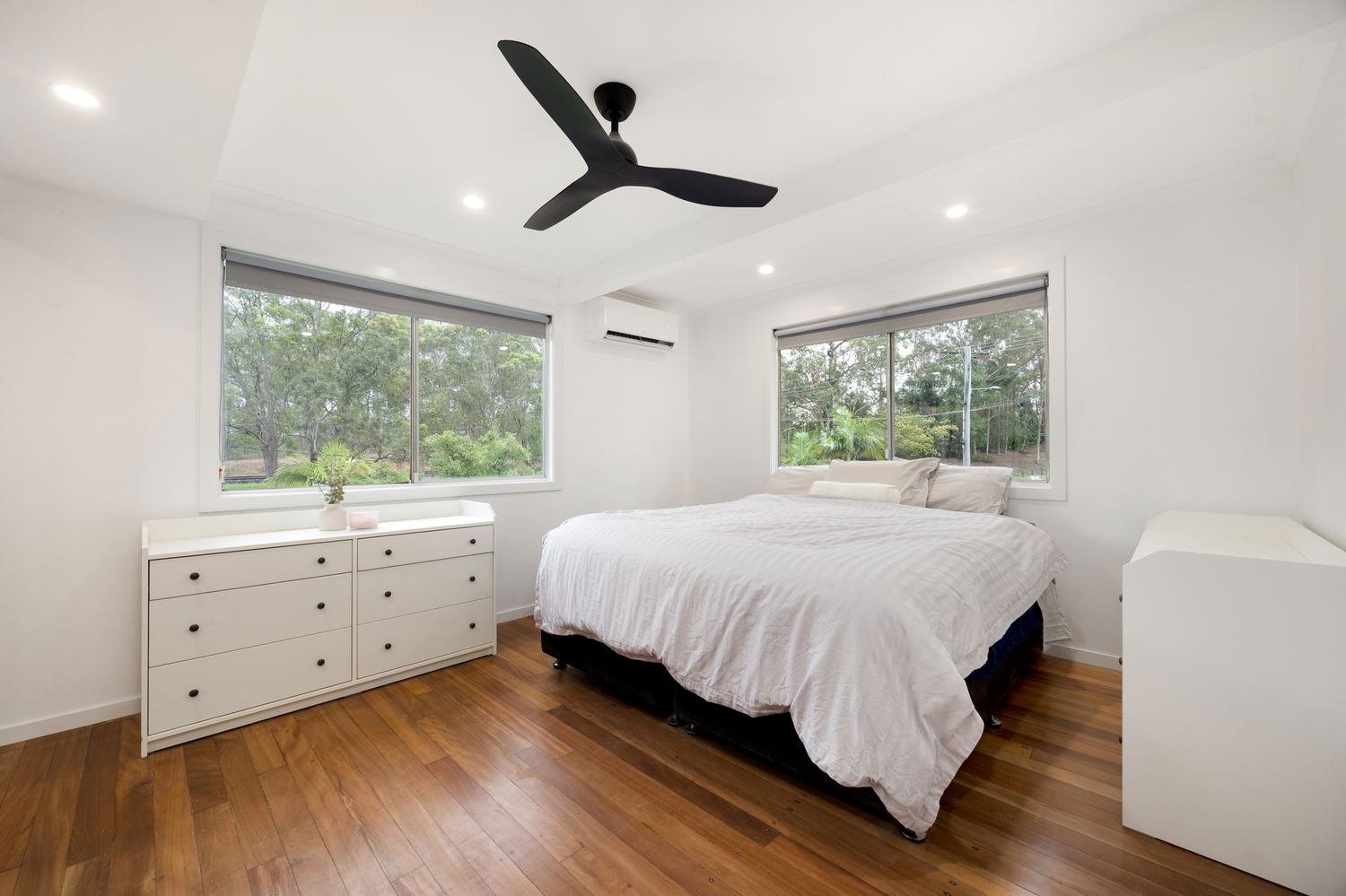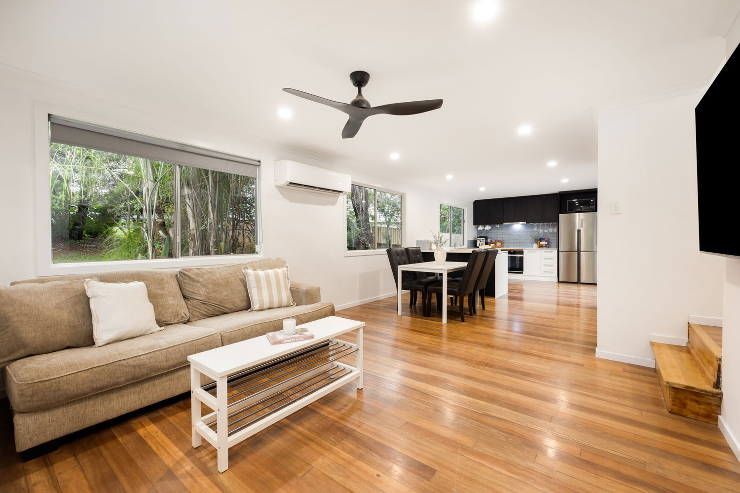 Step inside and be greeted by polished timber floorboards that flow throughout the home, creating a warm and inviting atmosphere. All three bedrooms feature built-in robes and ceiling fans, while the master bedroom also includes air conditioning for year-round comfort.