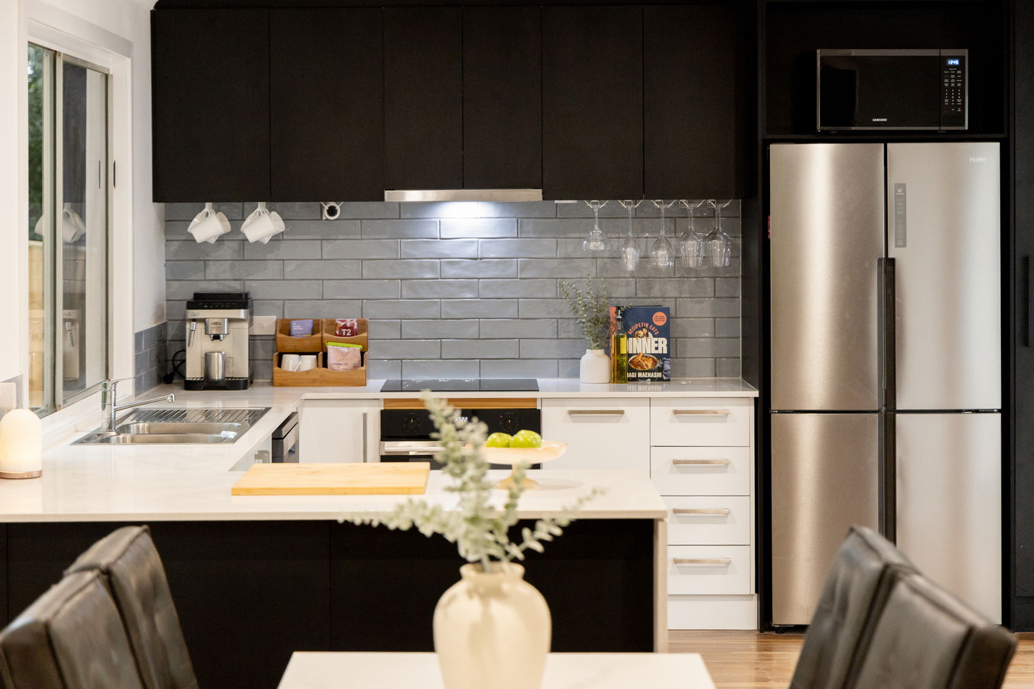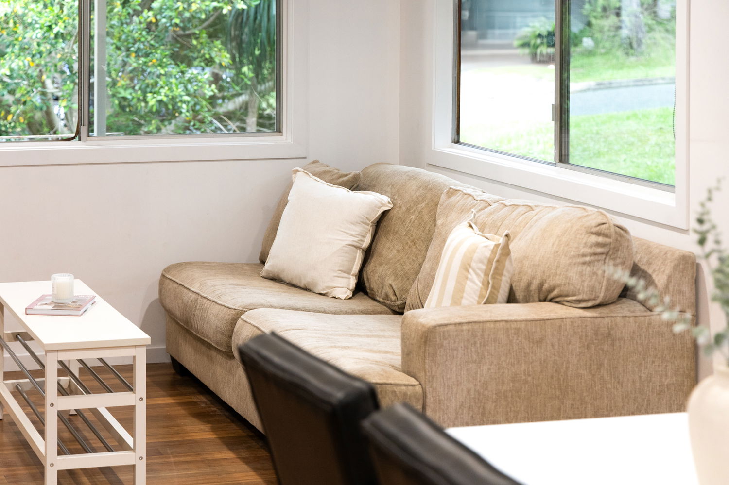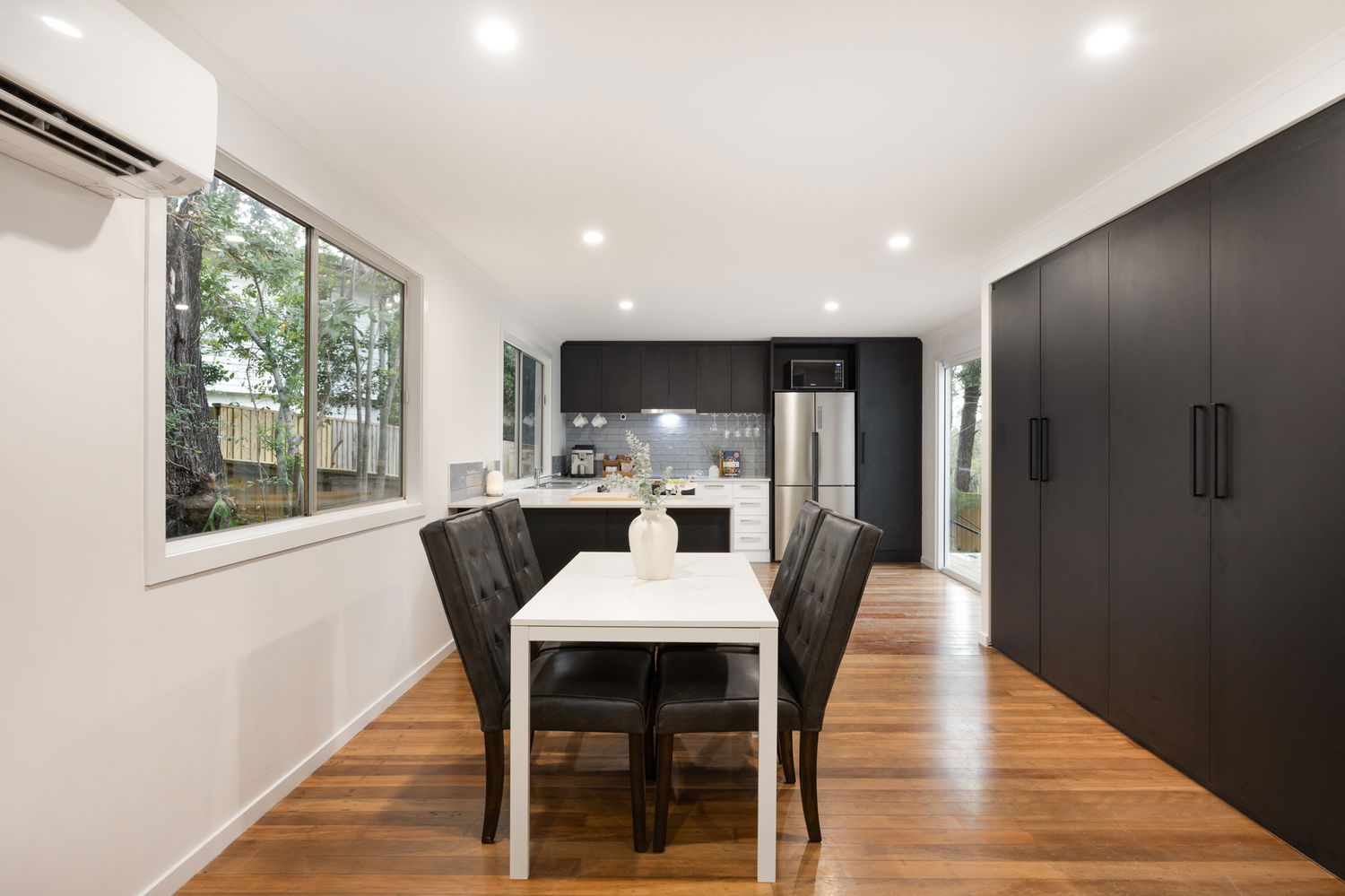 The fully renovated kitchen boasts quality finishes and modern appliances, seamlessly connecting to the spacious living area — which also features air conditioning, ensuring comfort in every season. The renovated bathroom continues the stylish theme, offering contemporary fixtures and a fresh, modern feel.