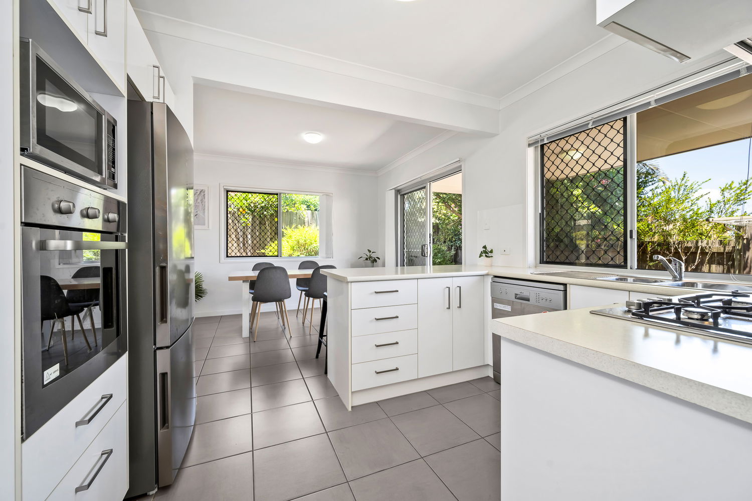 Downstairs, the home is centred around a generous open-plan living and dining area featuring air-conditioning and a ceiling fan, creating a comfortable everyday living space. This zone flows effortlessly to the covered outdoor patio, making it ideal for relaxed entertaining or quiet enjoyment. Overlooking the patio, the kitchen is well appointed with stainless steel appliances including a dishwasher, gas cooktop and oven, along with ample bench and storage space.