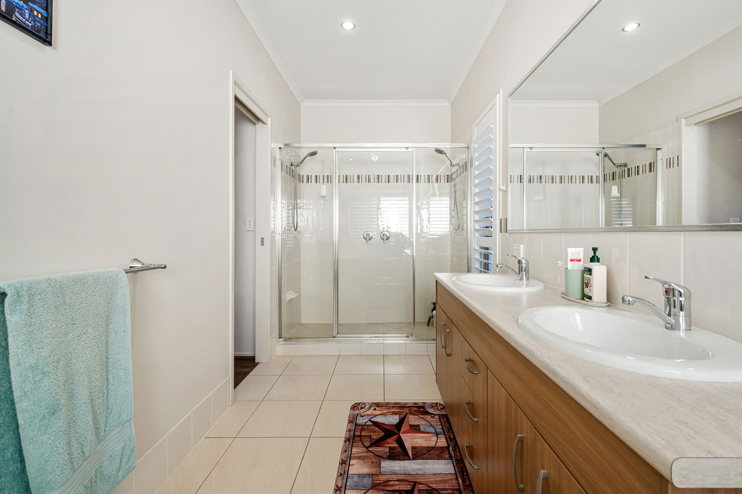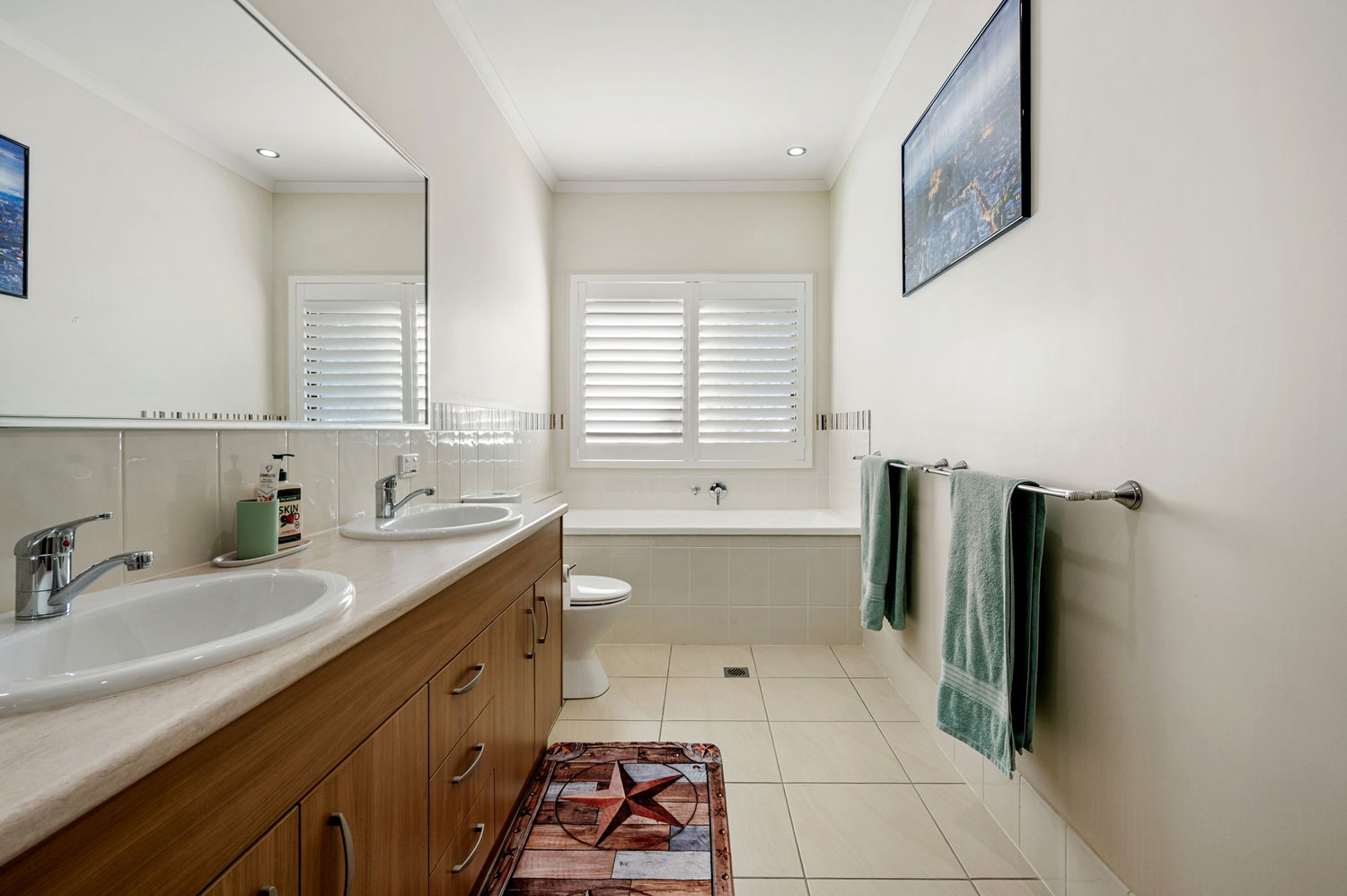 – Main bedroom with a walk-in robe, air-conditioning, glass sliding door access to alfresco and a luxurious ensuite with double vanity and bath