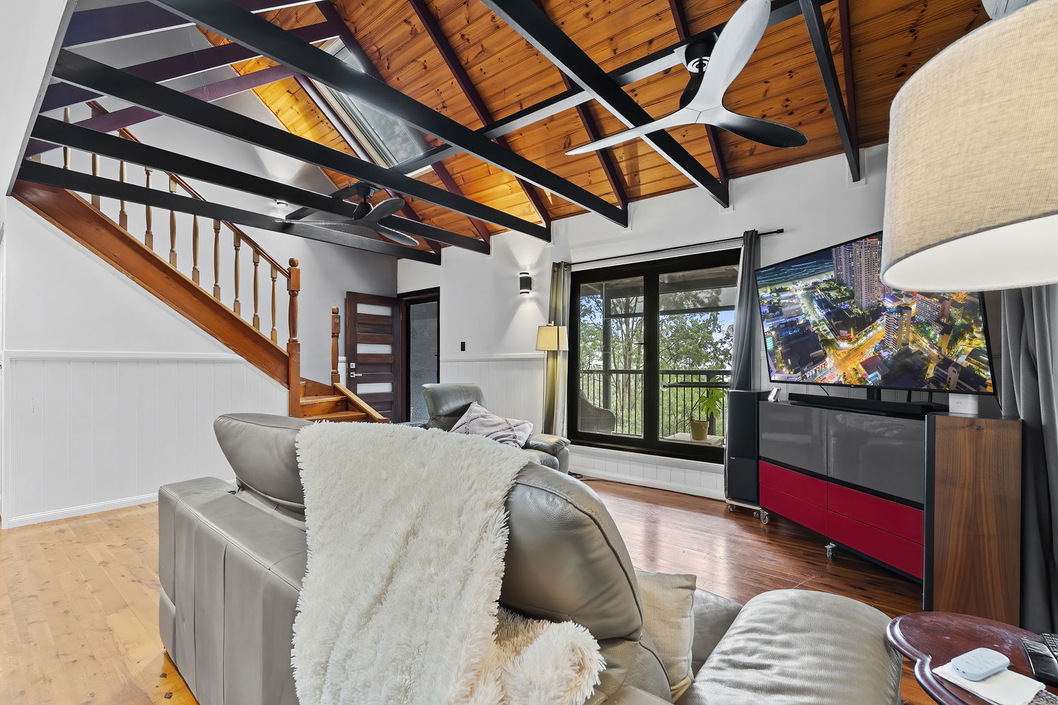 Upon entering the home, you are greeted with stunning timber flooring that carry on through majority of the property which are offset by pitched ceilings with exposed beams. A well-executed tiered layout showcases the architectural flair by creating distinct spaces yet keeping all interconnected.