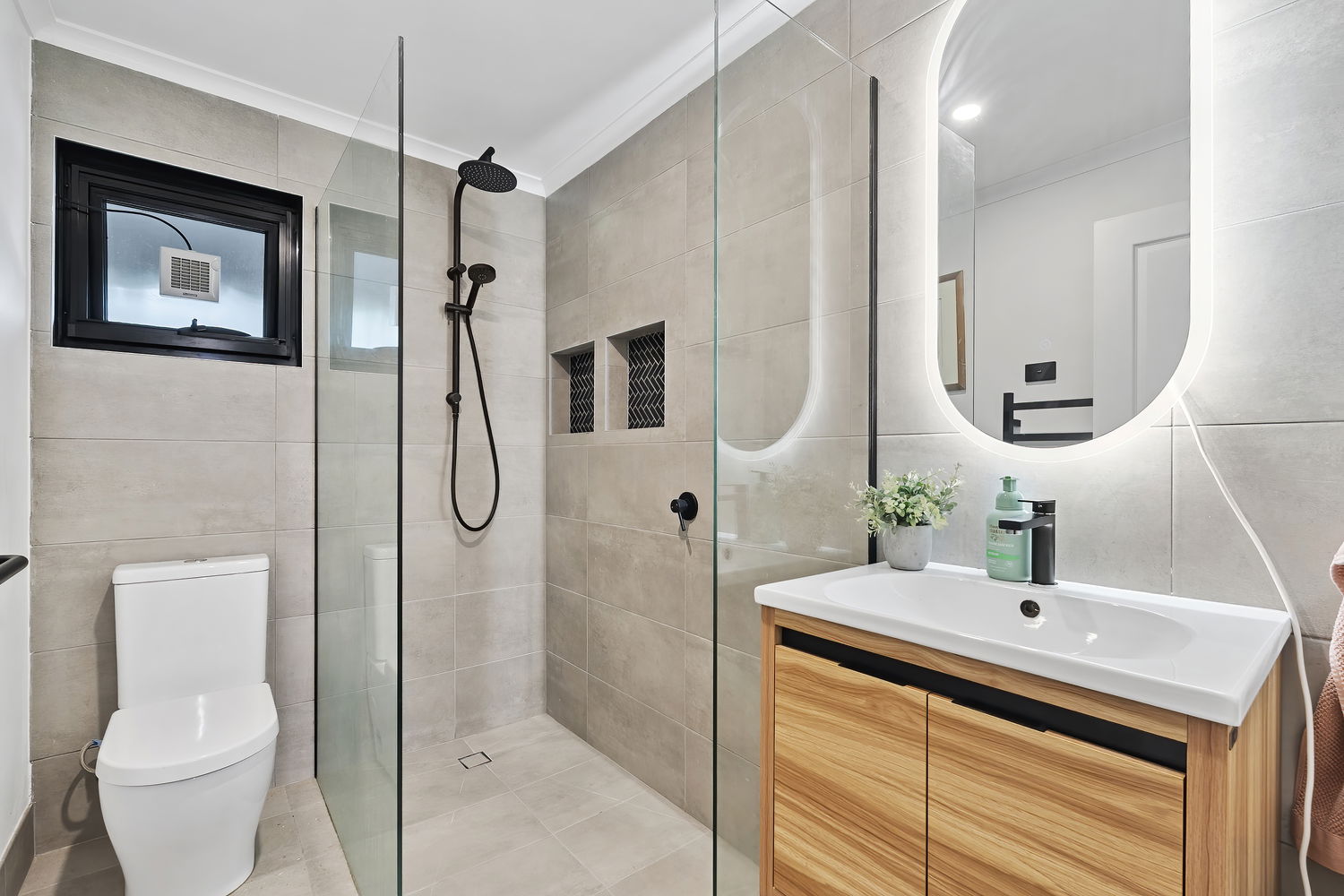 Two good sized bedrooms are zoned separately from the master. The contemporary main bathroom services these with large walk-in shower, toiletry niches, single vanity with backlit mirror and toilet. The large laundry completes the downstairs accommodation.