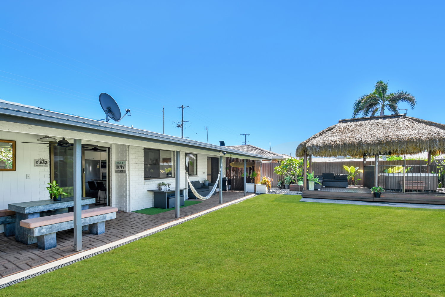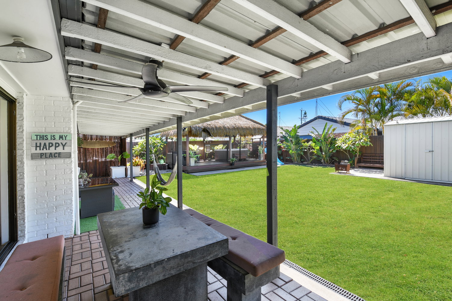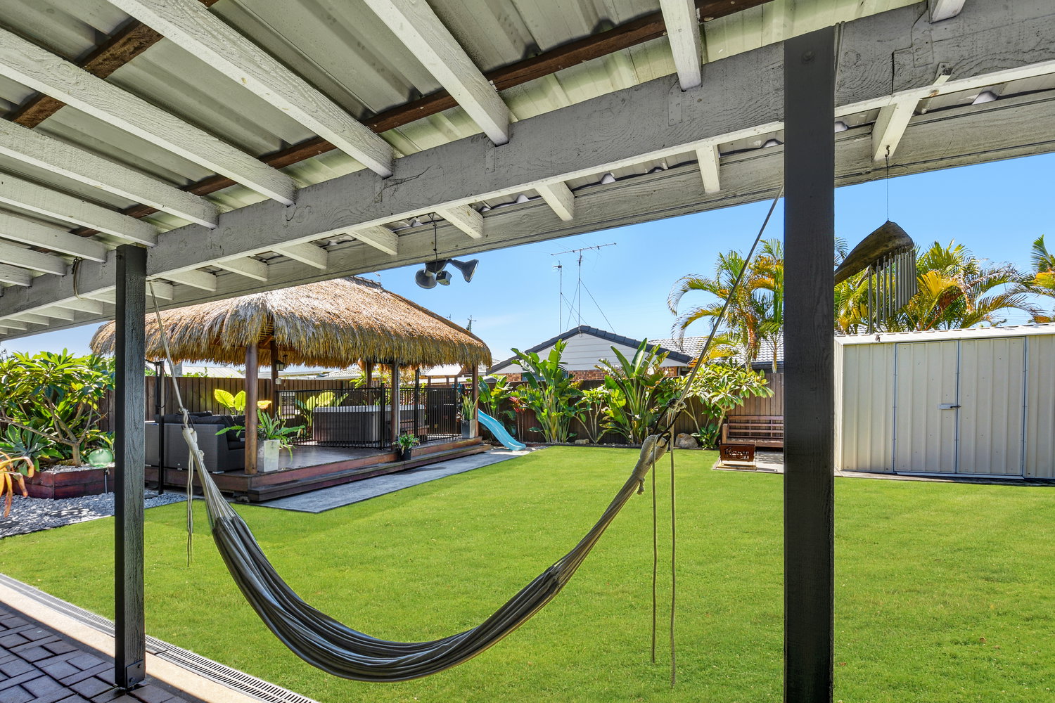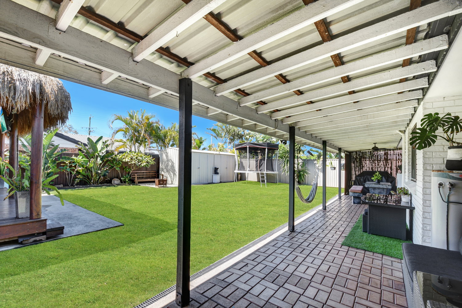 Step outside and the backyard becomes something else entirely — a private sanctuary dressed in tropical calm. A large covered alfresco spills out to a beautifully appointed backyard where a Balinese-style gazebo sets the scene for evenings that need no particular occasion. Whether it’s a quiet night under the stars or a leisurely weekend lunch in the shade, the outdoor amenity here genuinely rivals what you’d find at a boutique resort — without ever leaving home.