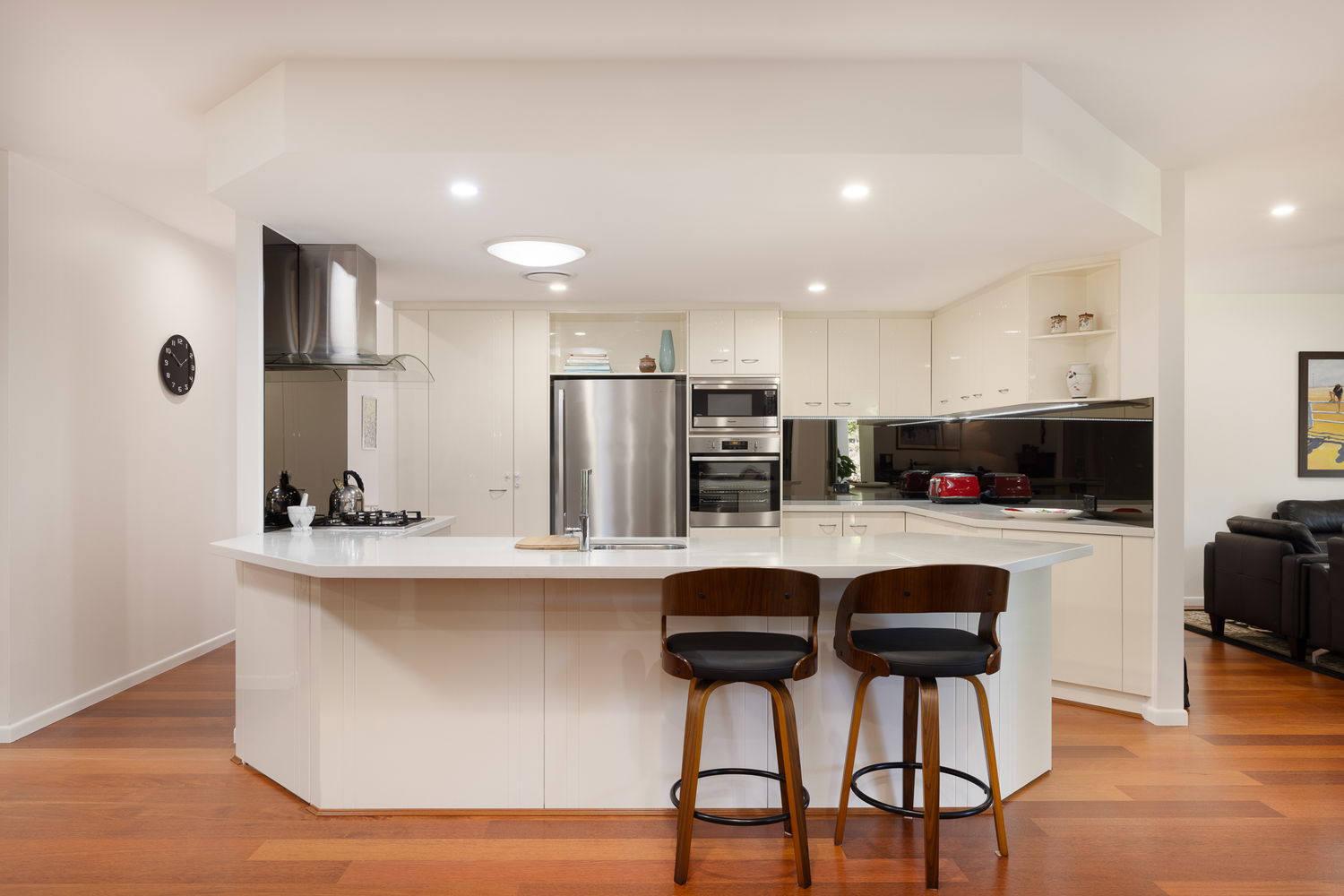 The north facing modern home offers four bedrooms, three bathrooms, study and three large internal living spaces across two levels and 350m2. Architecturally designed this clever floor plan begins with the light filled foyer that leads to the multiple open plan living zones, all boasting extra high ceilings and generous dimensions. The kitchen is located in the heart of the open plan living ideal for restful indoor–outdoor living and seamless entertaining.