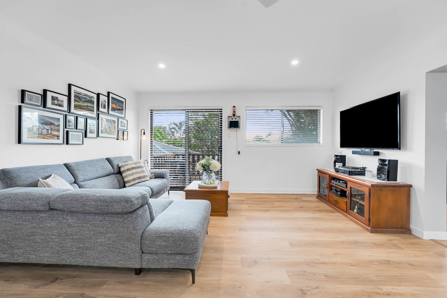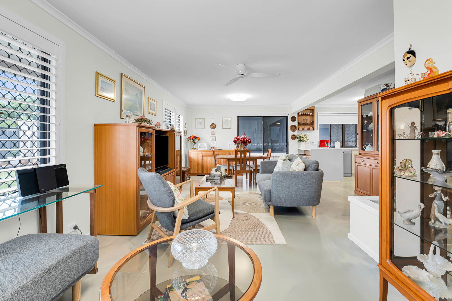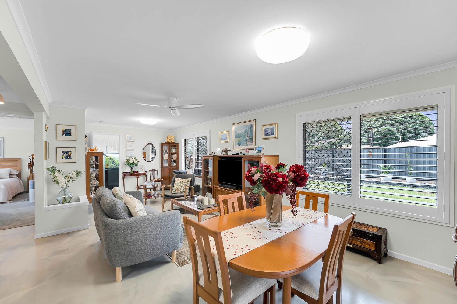 – Large open plan living and dining area with neutral tones and oversized windows and plantation shutters