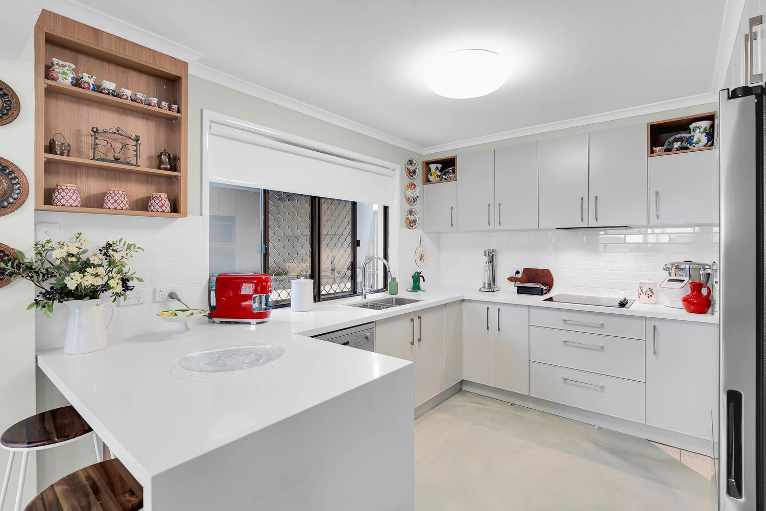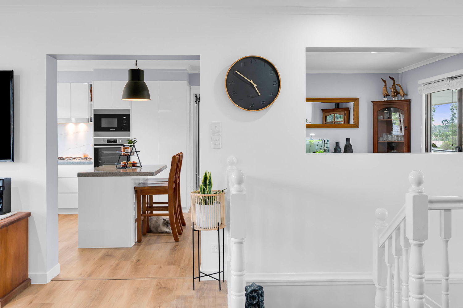 – Kitchen (replaced 3 years ago) featuring 40mm stone waterfall bench, ample overhead and under bench cabinetry, 600mm electric cooktop, wall mounted oven, rangehood and dishwasher