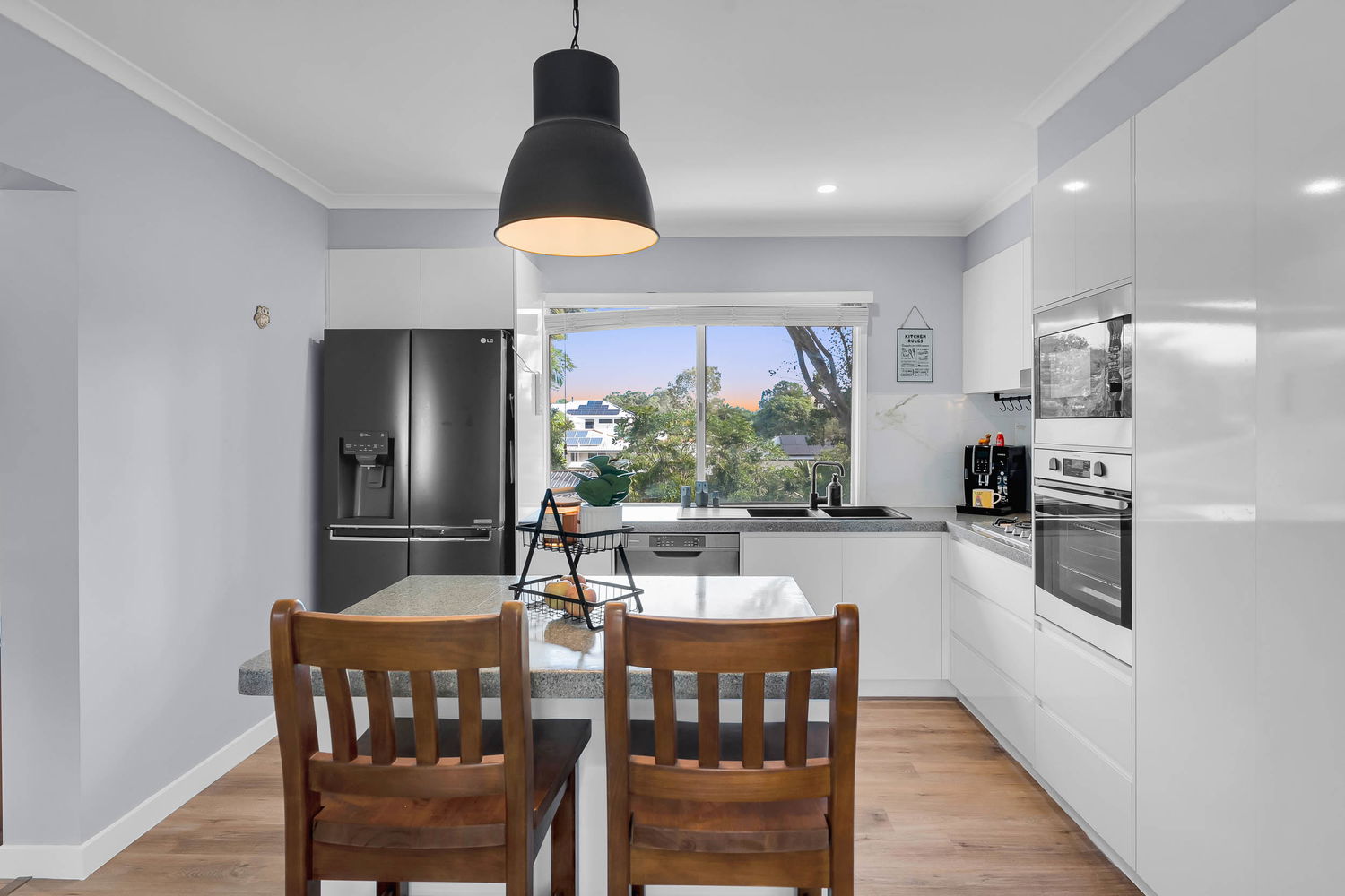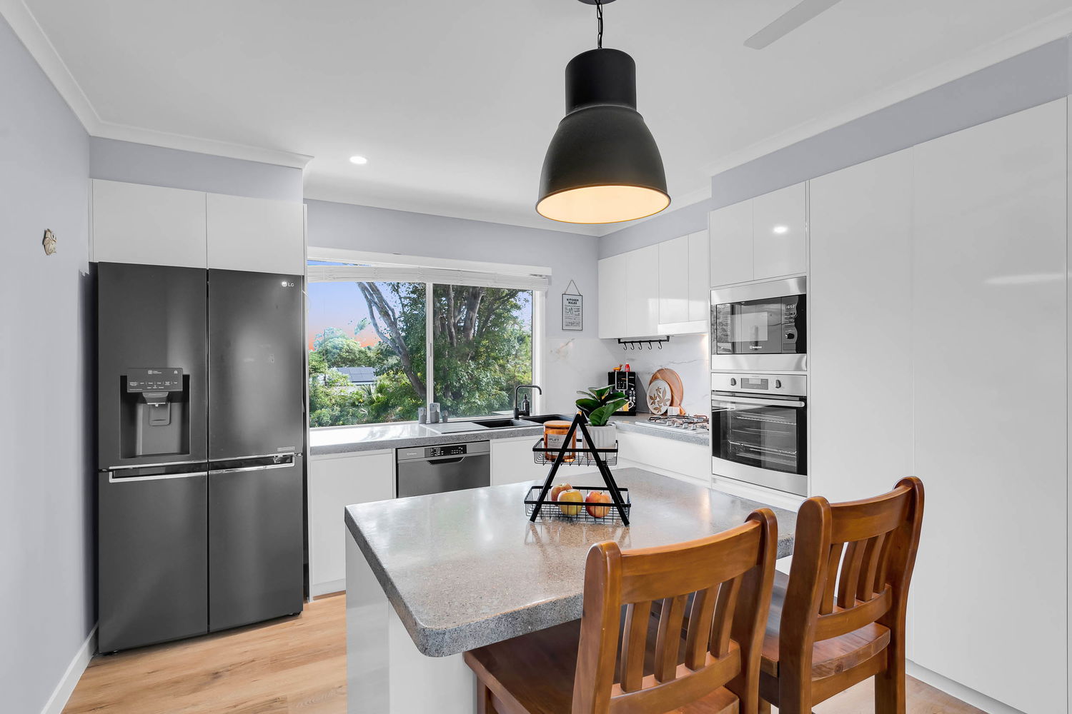 – Modern kitchen with island bench, double black sink, 600mm gas cooktop, wall mounted electric oven and double pantry