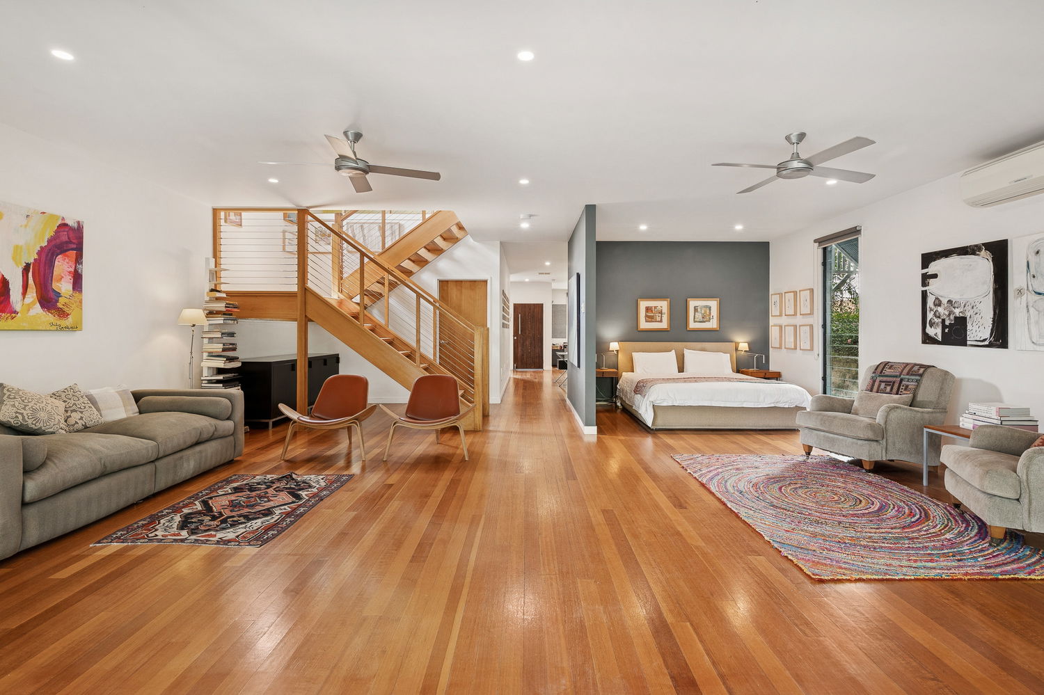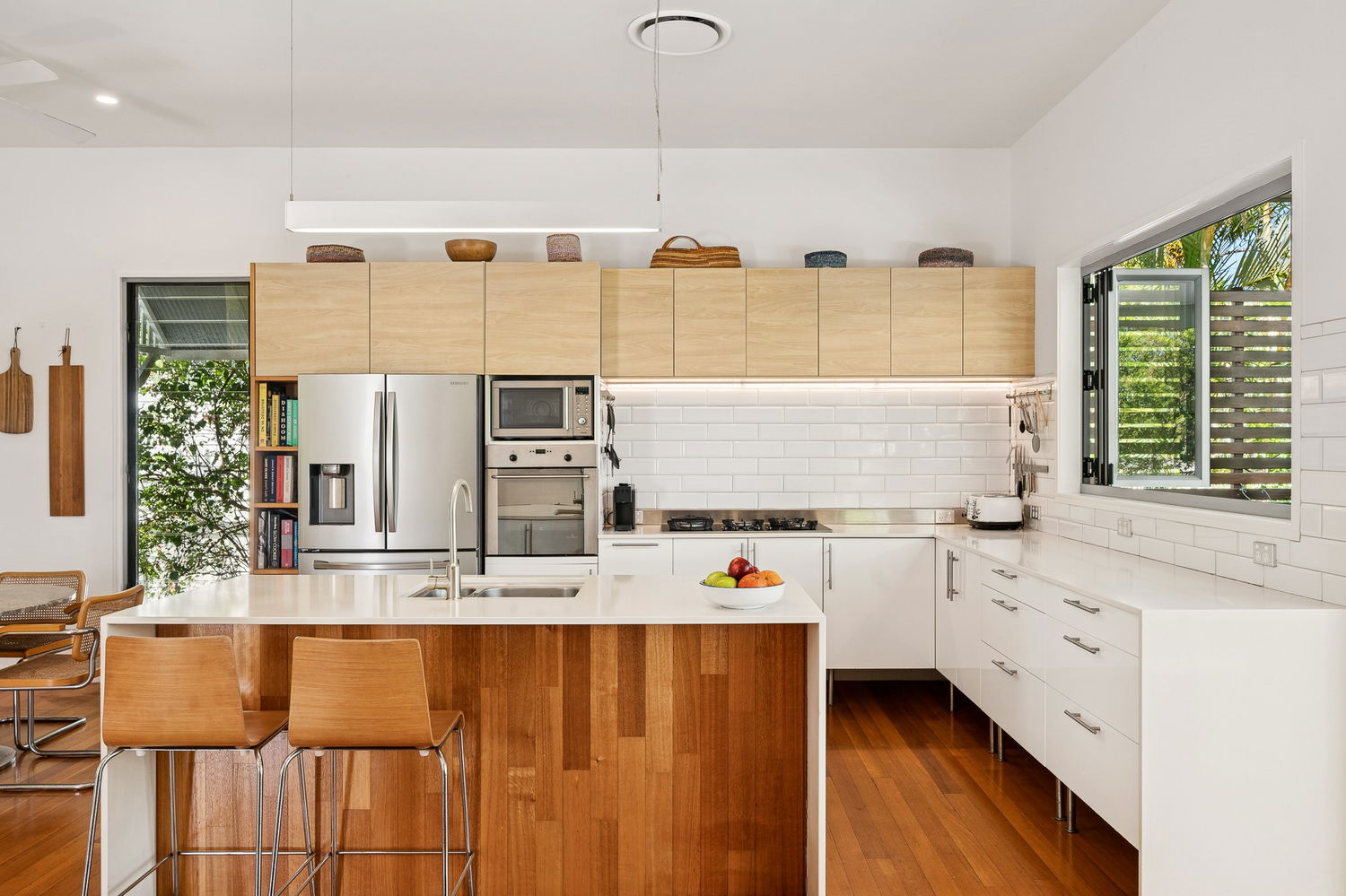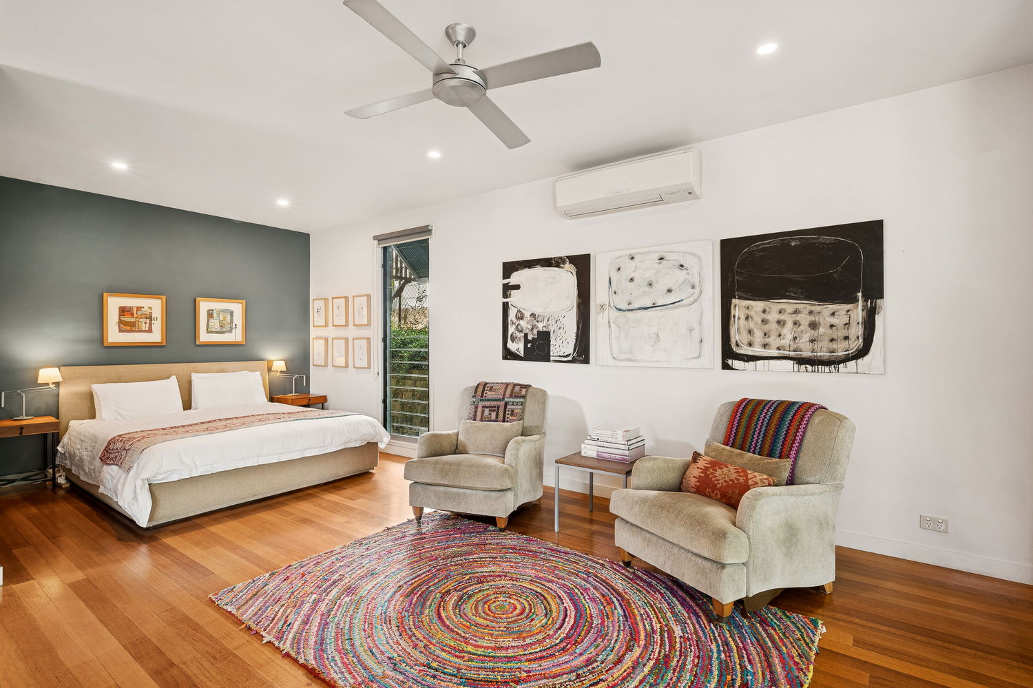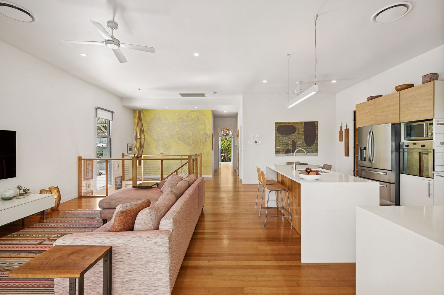 At the heart of the residence, the gourmet kitchen exudes sophistication with its oversized island bench, premium stone benchtops, gas cooktop, and bespoke cabinetry. Perfectly positioned to capture gentle cross-breezes, the home’s elevated setting enhances its sense of serenity, while ducted air-conditioning and ceiling fans ensure effortless year-round comfort.
