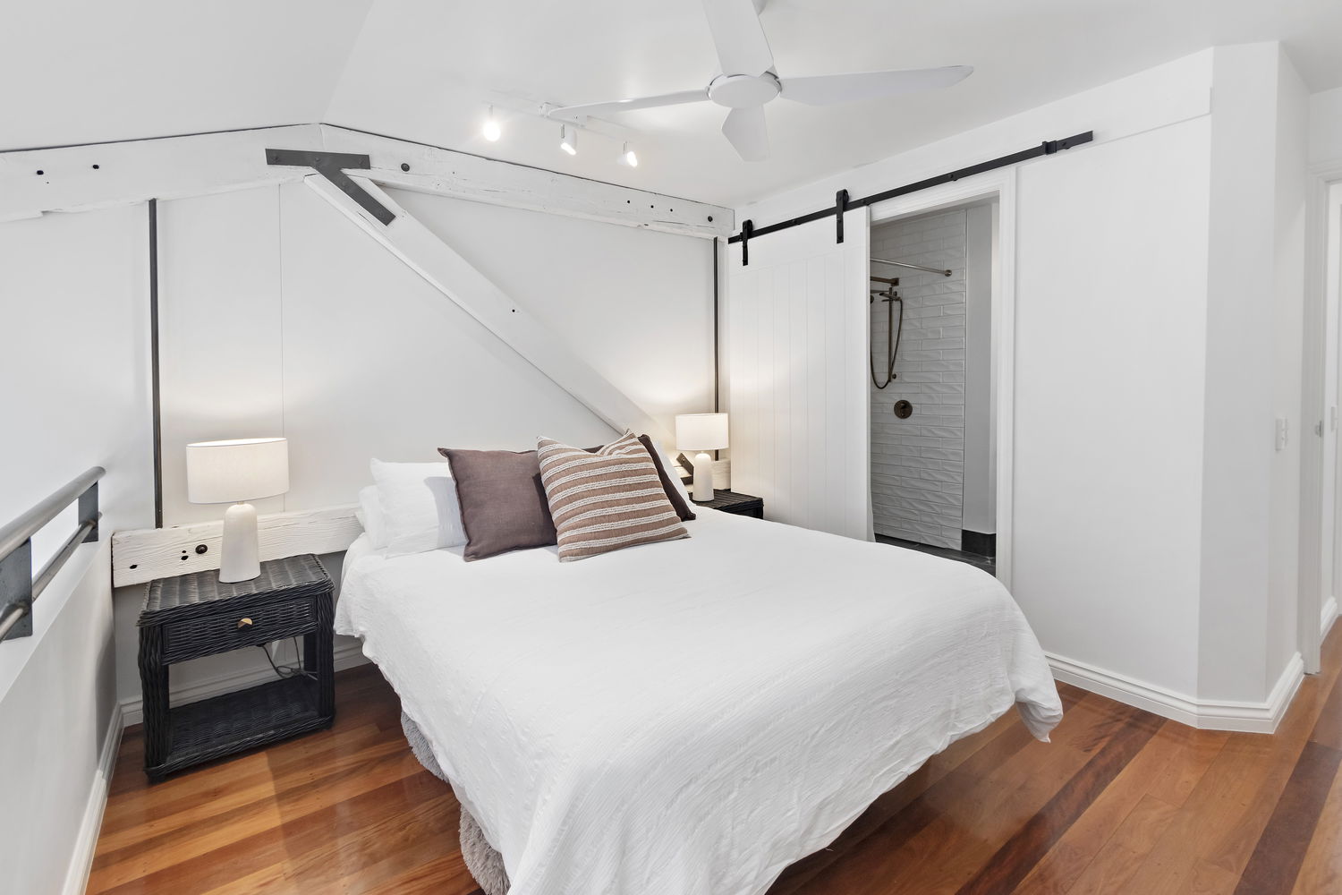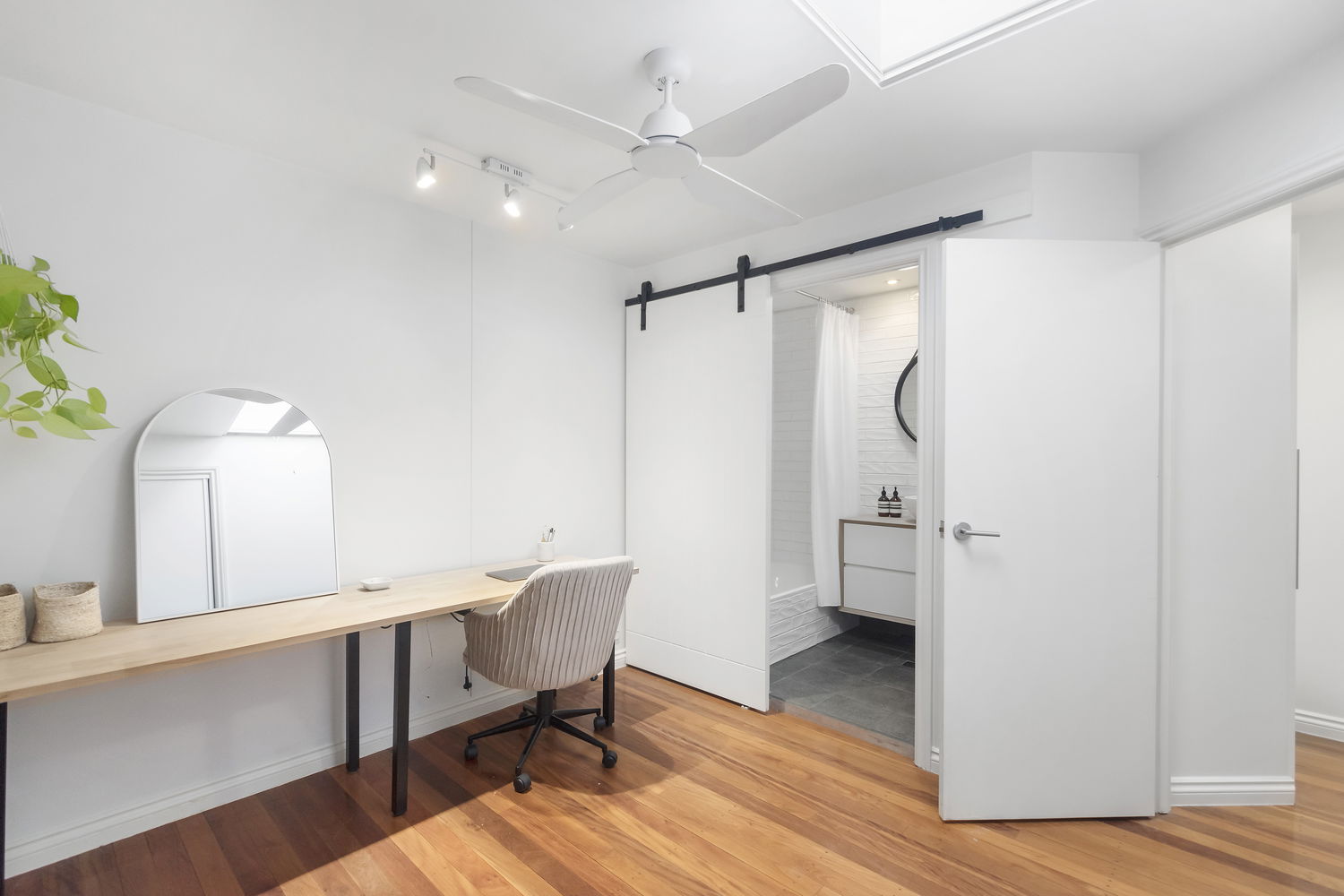 Dedicated to privacy and repose, two bedrooms occupy the upper level of the home, both enjoying built-in storage and new ensuite bathrooms. The master has the additional wow factor of enjoying a loft style setting with exceptional vantage of the cathedral windows and exposed beams bringing warming character. Both ensuite bathrooms showcase impeccable design with floor to ceiling subway tiling, high-end tap ware and bespoke floating vanity units with Tasmanian Oak features. A new powder room downstairs matches in class and sophistication and services any guests with distinction with an adjacent new laundry impressing with exceptional storage. The single secure car park also includes a new lockable storage unit – perfect for storing bikes, gardening gear or tools.