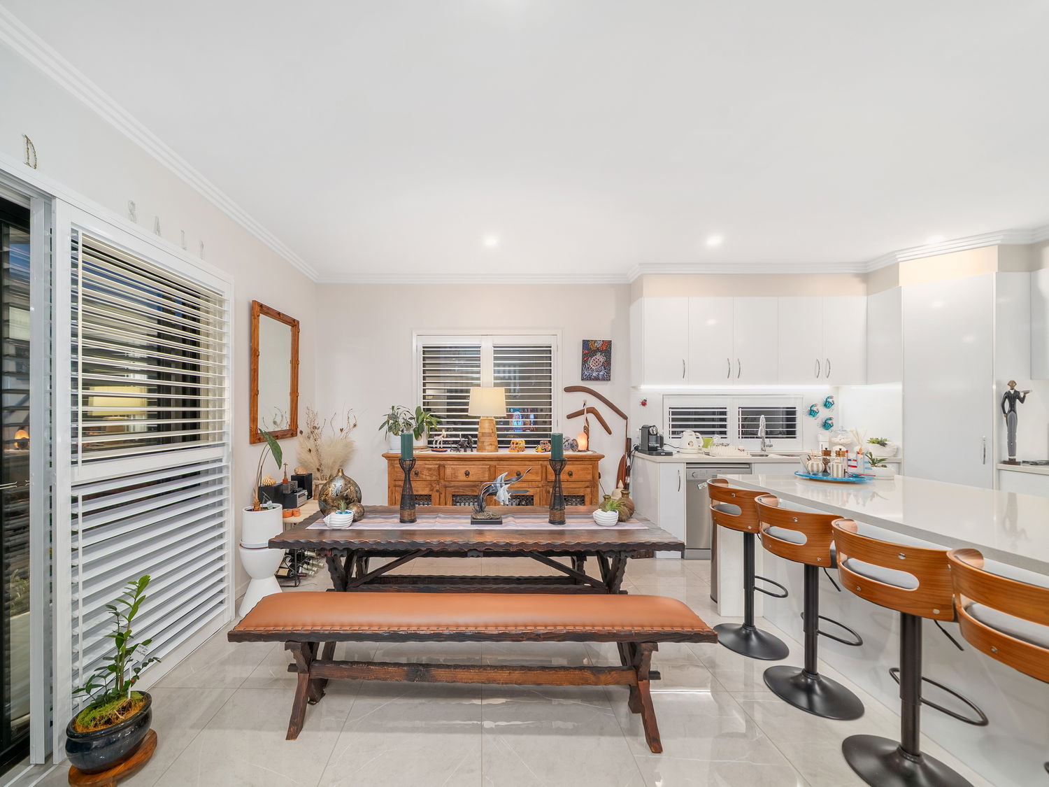 The oversized rear deck overlooking the sparkling saltwater pool is ideal for entertaining, complete with built-in stone-topped benches for food preparation and built-in cupboards for extra storage. Decking around the pool and rear steps has been freshly stained, enhancing the polished, low-maintenance outdoor spaces that make this property so appealing.
