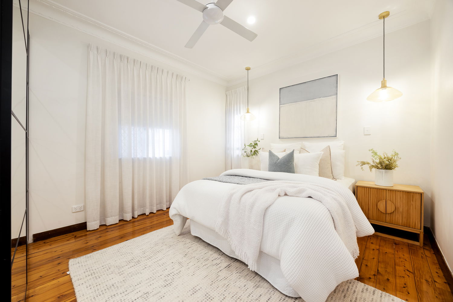 The home features three well-proportioned bedrooms, each filled with natural light and rich cypress pine flooring. The main bedroom includes a built-in robe and ceiling fan for added comfort, while the remaining two bedrooms offer versatile spaces ideal for children, guests, or a home office.