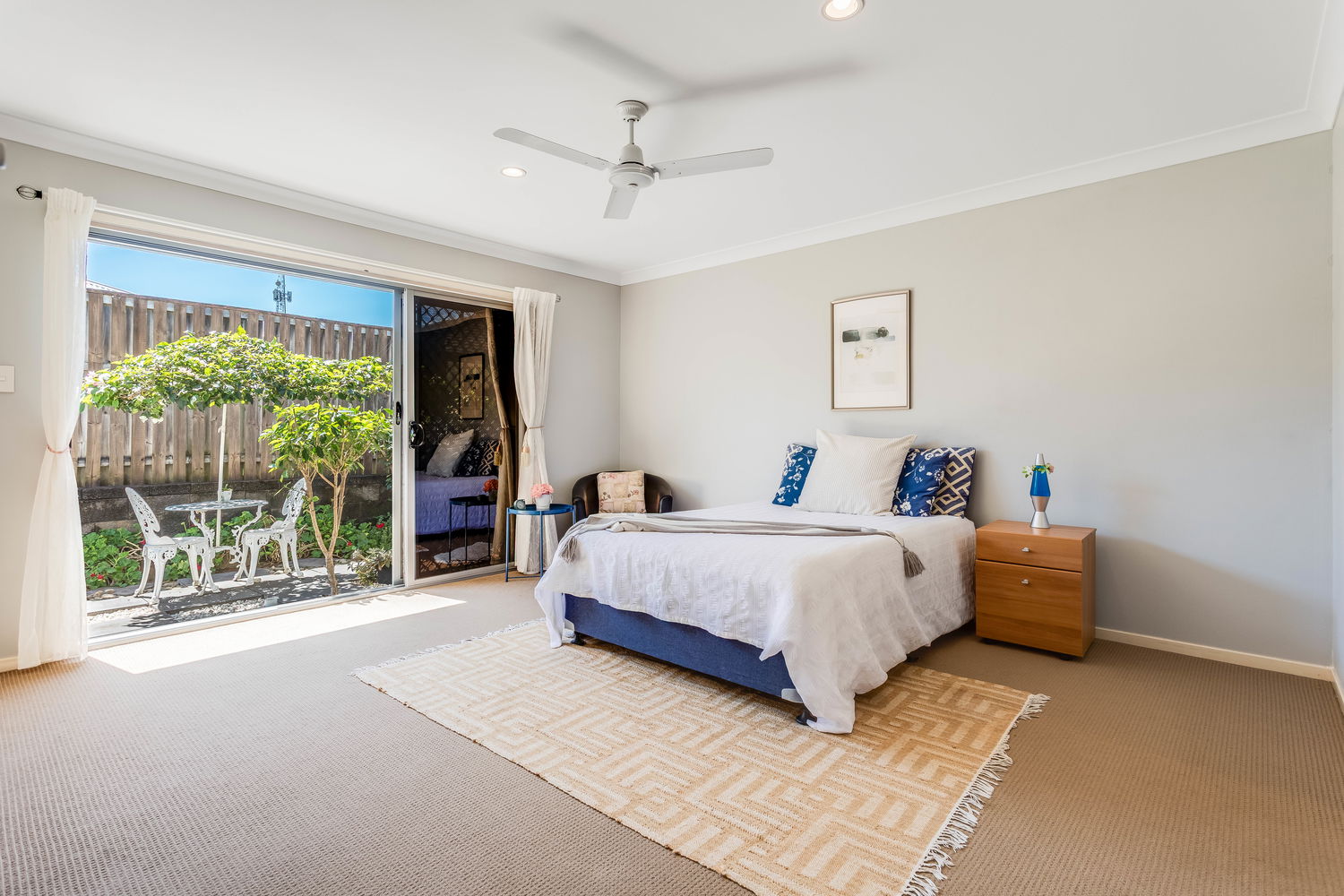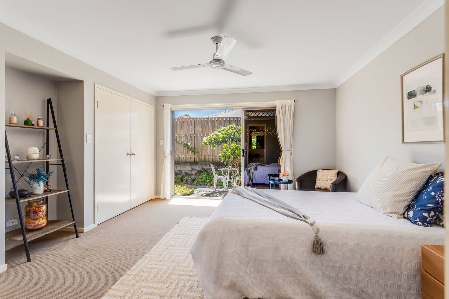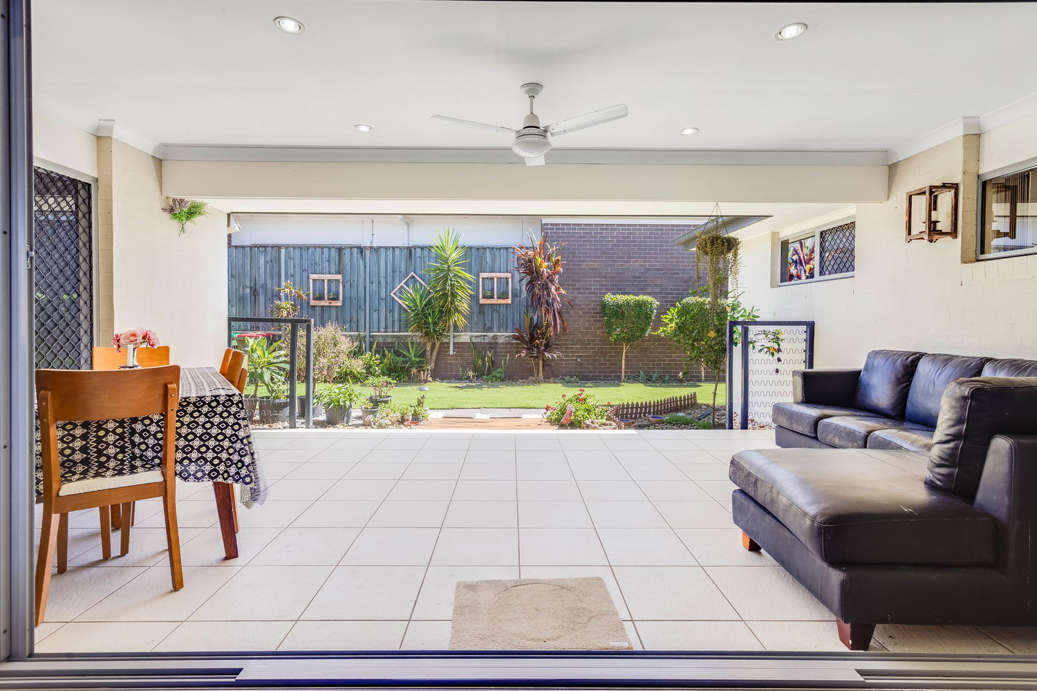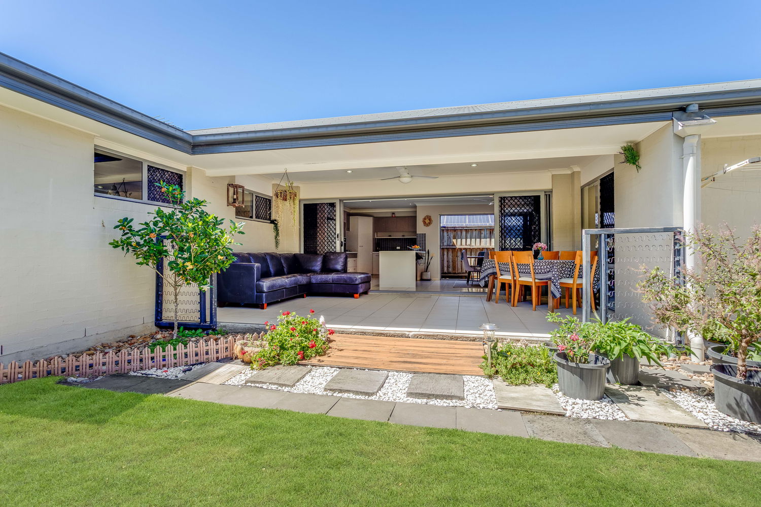Accommodation is cleverly zoned for privacy. The main bedroom is tucked away at the rear and enjoys a lovely outlook over its own private courtyard garden, accessed by sliding doors. This leafy space feels like a little sanctuary – ideal for a quiet morning coffee or winding down at the end of the day. A walk-in robe and ensuite complete this peaceful retreat. Bedrooms two and three are set in their own wing close to the family bathroom and laundry, making it ideal for children or guests. Both are well-proportioned with built-in robes and ceiling fans.