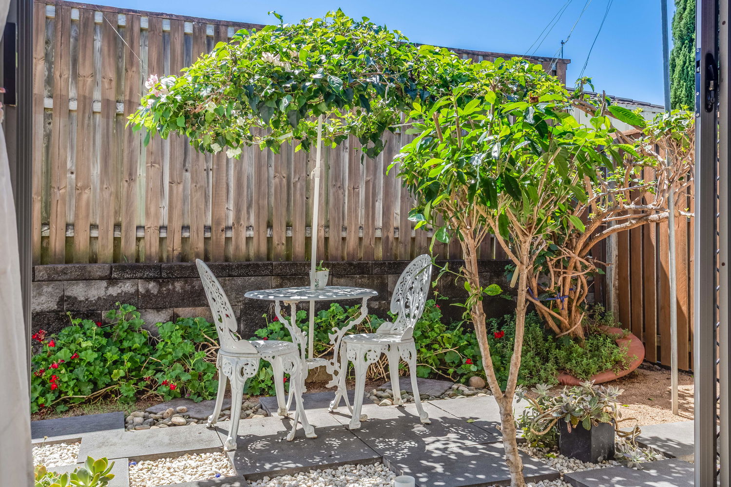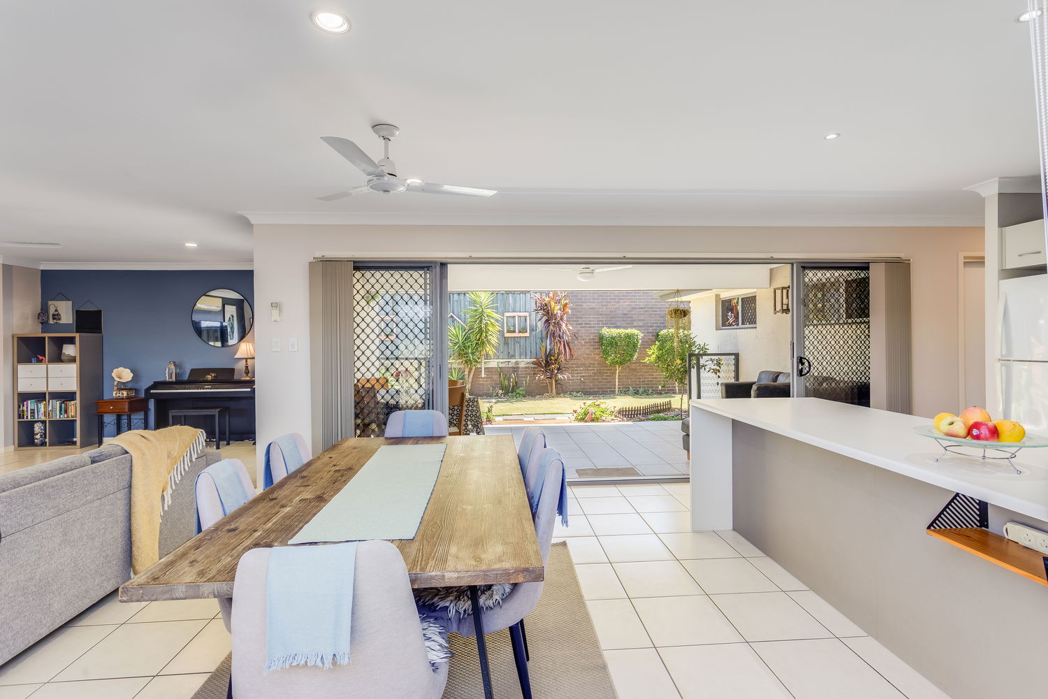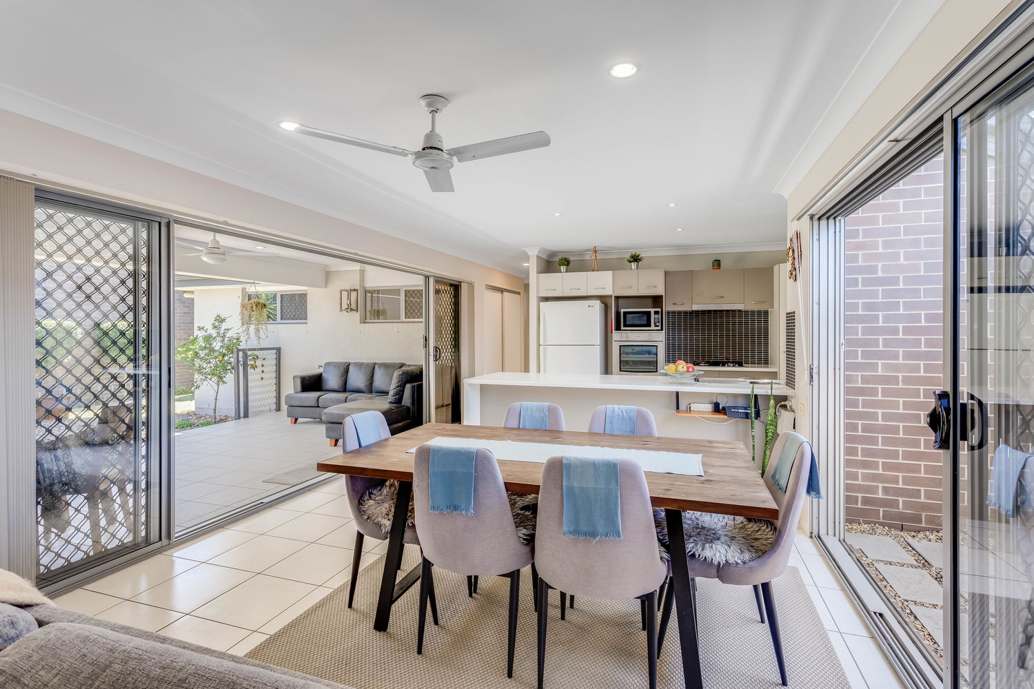 Accommodation is cleverly zoned for privacy. The main bedroom is tucked away at the rear and enjoys a lovely outlook over its own private courtyard garden, accessed by sliding doors. This leafy space feels like a little sanctuary – ideal for a quiet morning coffee or winding down at the end of the day. A walk-in robe and ensuite complete this peaceful retreat. Bedrooms two and three are set in their own wing close to the family bathroom and laundry, making it ideal for children or guests. Both are well-proportioned with built-in robes and ceiling fans.