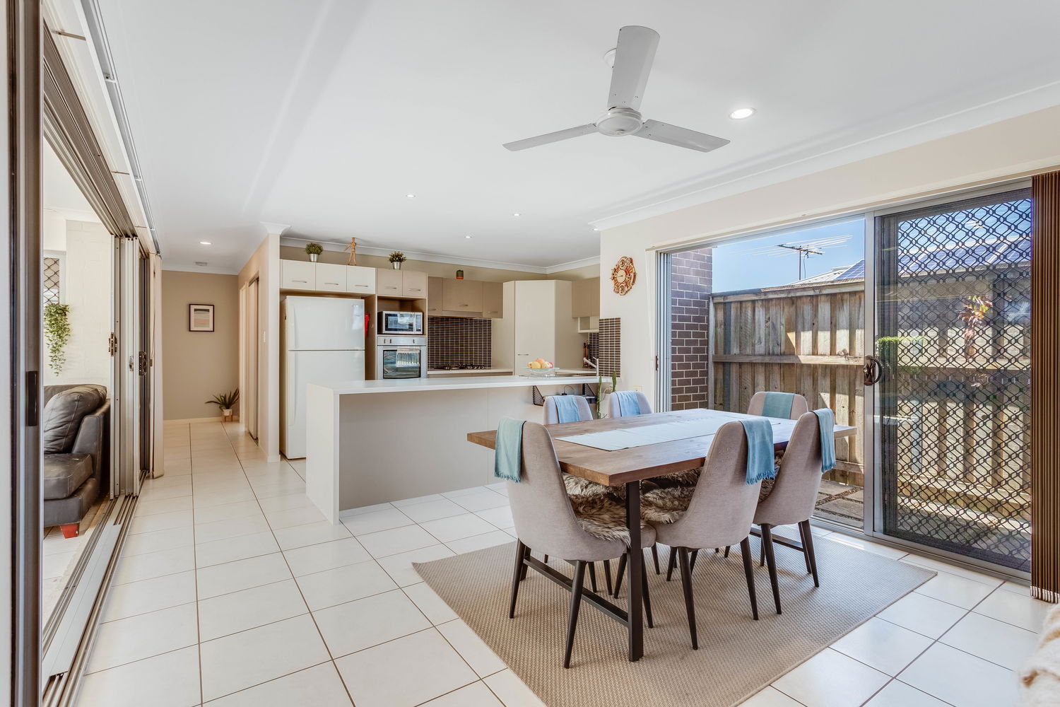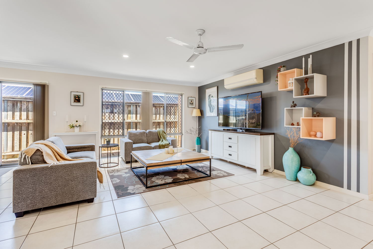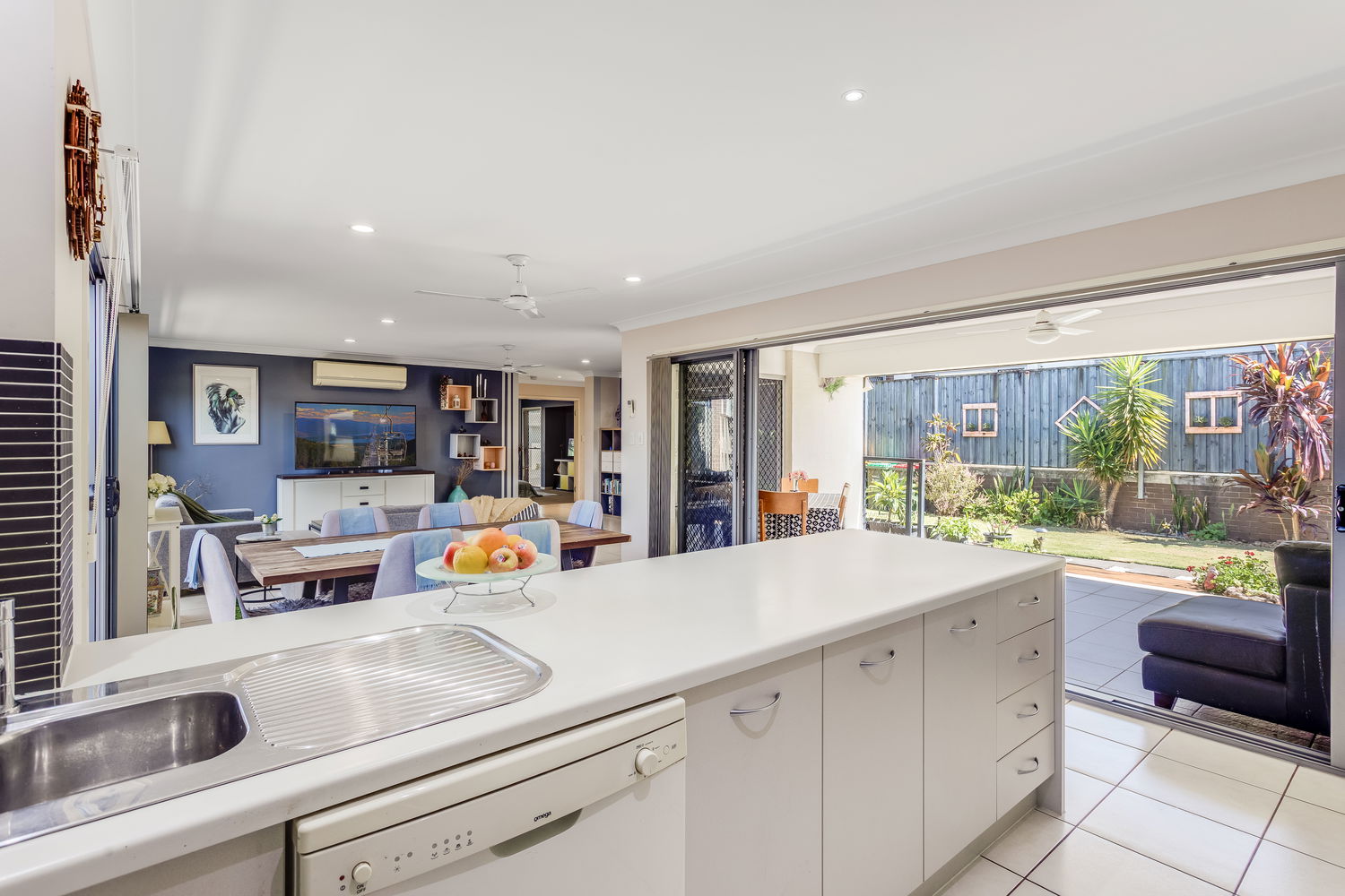 At the heart of the home is the light-filled open-plan living, meals and kitchen zone, framed by big windows and sliding doors that draw your eye out to the alfresco and rear lawn. The kitchen is perfectly positioned for everyday life and entertaining, with great bench space, a breakfast bar, dishwasher and plenty of storage, all overlooking the dining and living areas so you can stay connected with family and guests. The main living space enjoys air conditioning and cooling cross-breezes, and there is an easy flow out to the covered alfresco area, creating a true extension of the living space and the perfect spot for weekend BBQs, afternoon drinks or watching the kids and pets play on the grass.