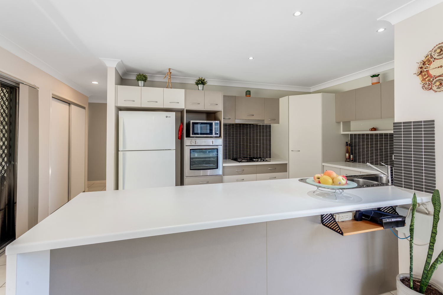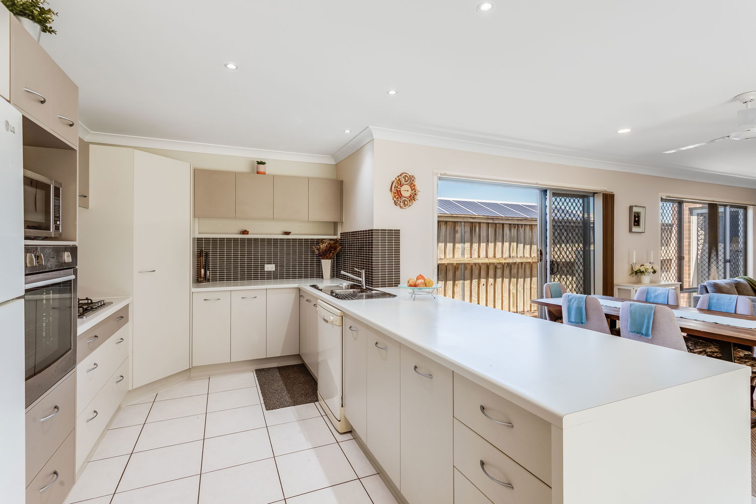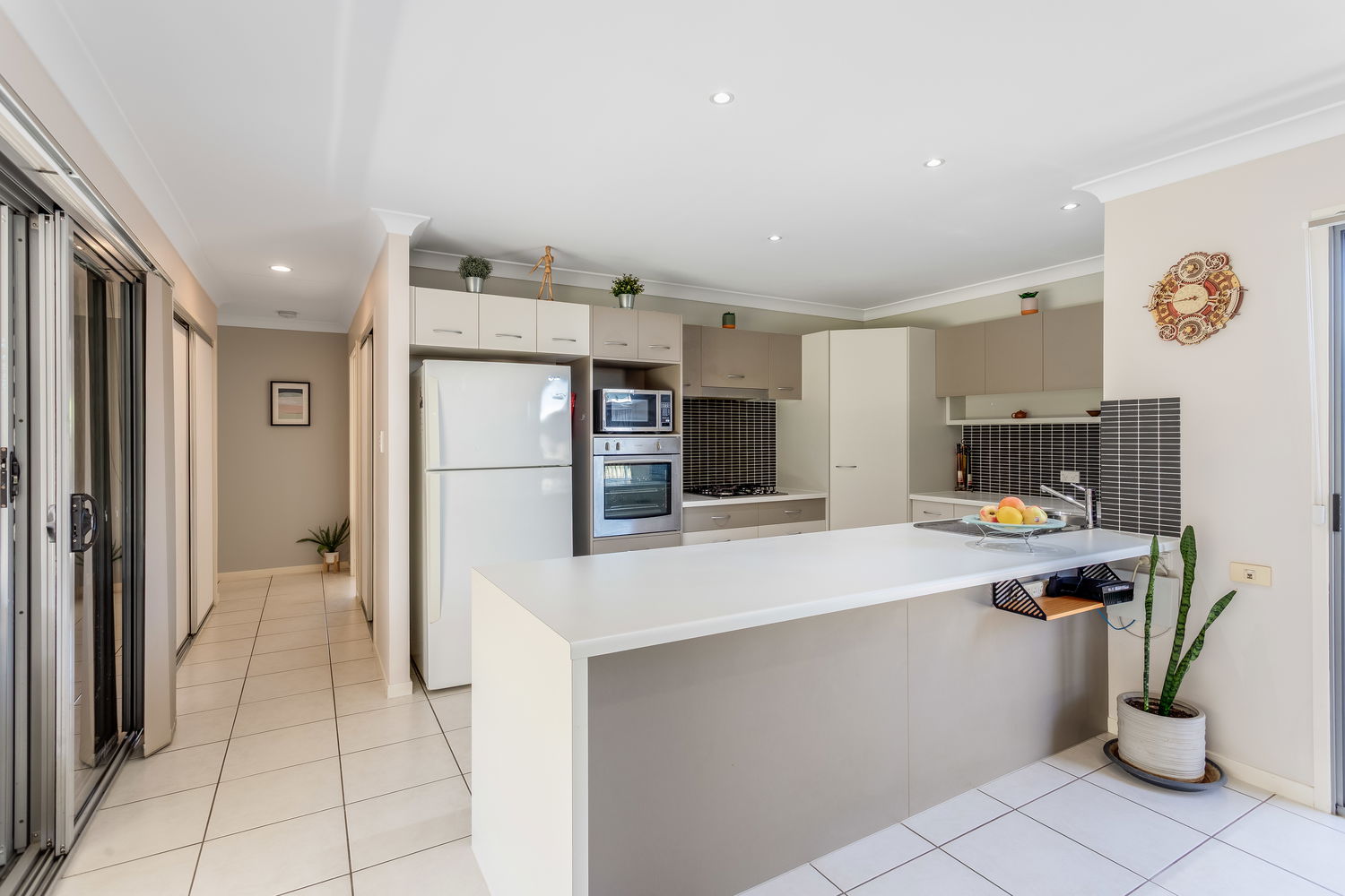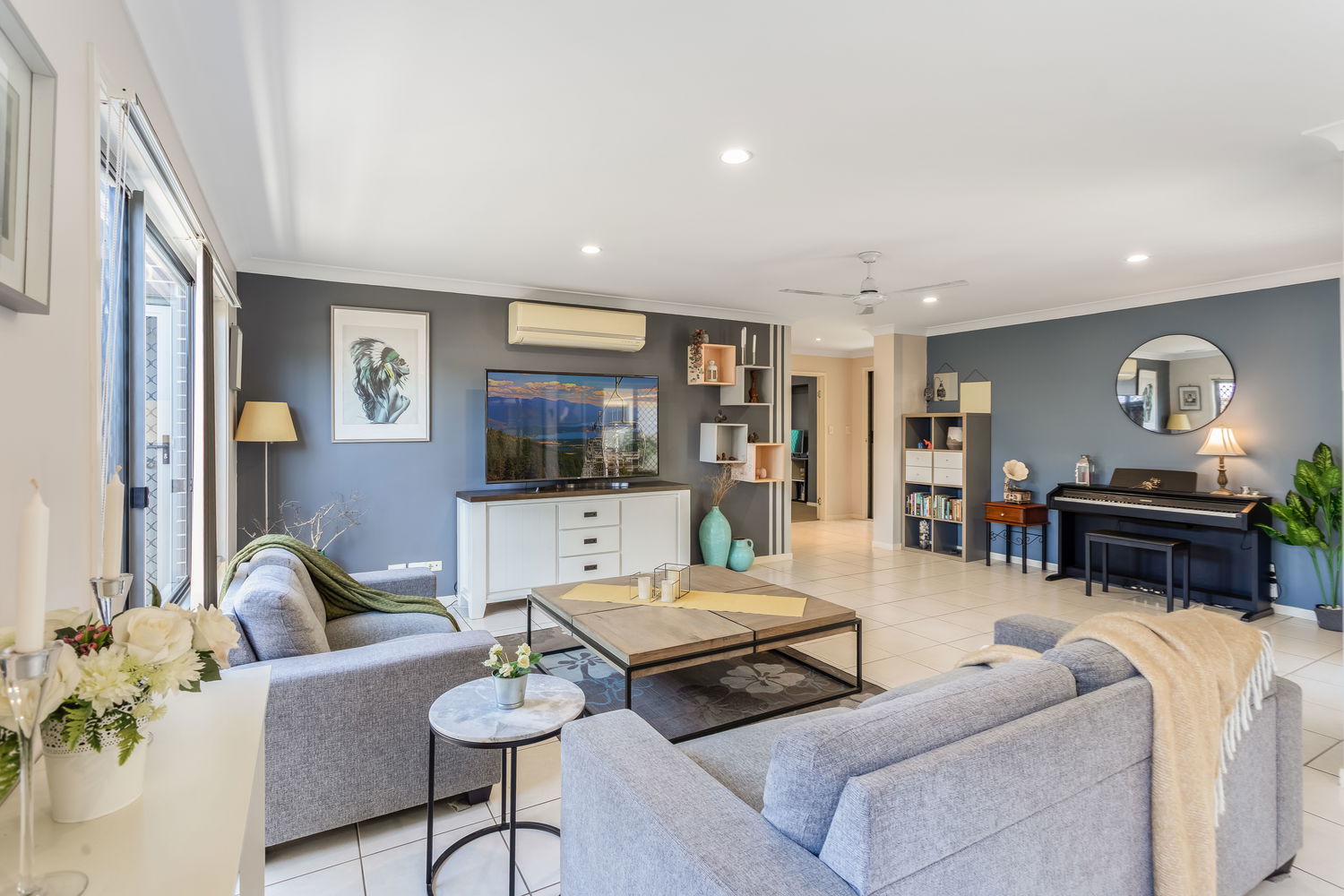 At the heart of the home is the light-filled open-plan living, meals and kitchen zone, framed by big windows and sliding doors that draw your eye out to the alfresco and rear lawn. The kitchen is perfectly positioned for everyday life and entertaining, with great bench space, a breakfast bar, dishwasher and plenty of storage, all overlooking the dining and living areas so you can stay connected with family and guests. The main living space enjoys air conditioning and cooling cross-breezes, and there is an easy flow out to the covered alfresco area, creating a true extension of the living space and the perfect spot for weekend BBQs, afternoon drinks or watching the kids and pets play on the grass.