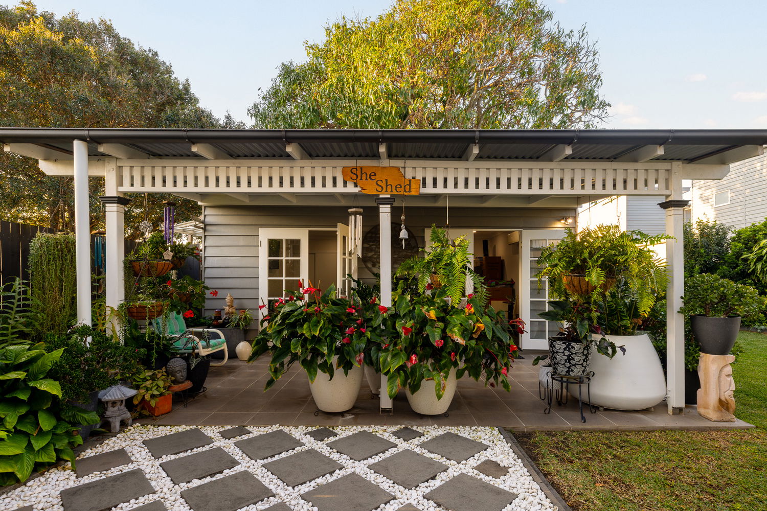 Tucked away in the rear garden, a separate studio complete with plumbing, electricity, and its own covered patio offers endless possibilities—whether as a creative workspace, a fully equipped home office, a private guest retreat, or the perfect setup for a home-based business.
