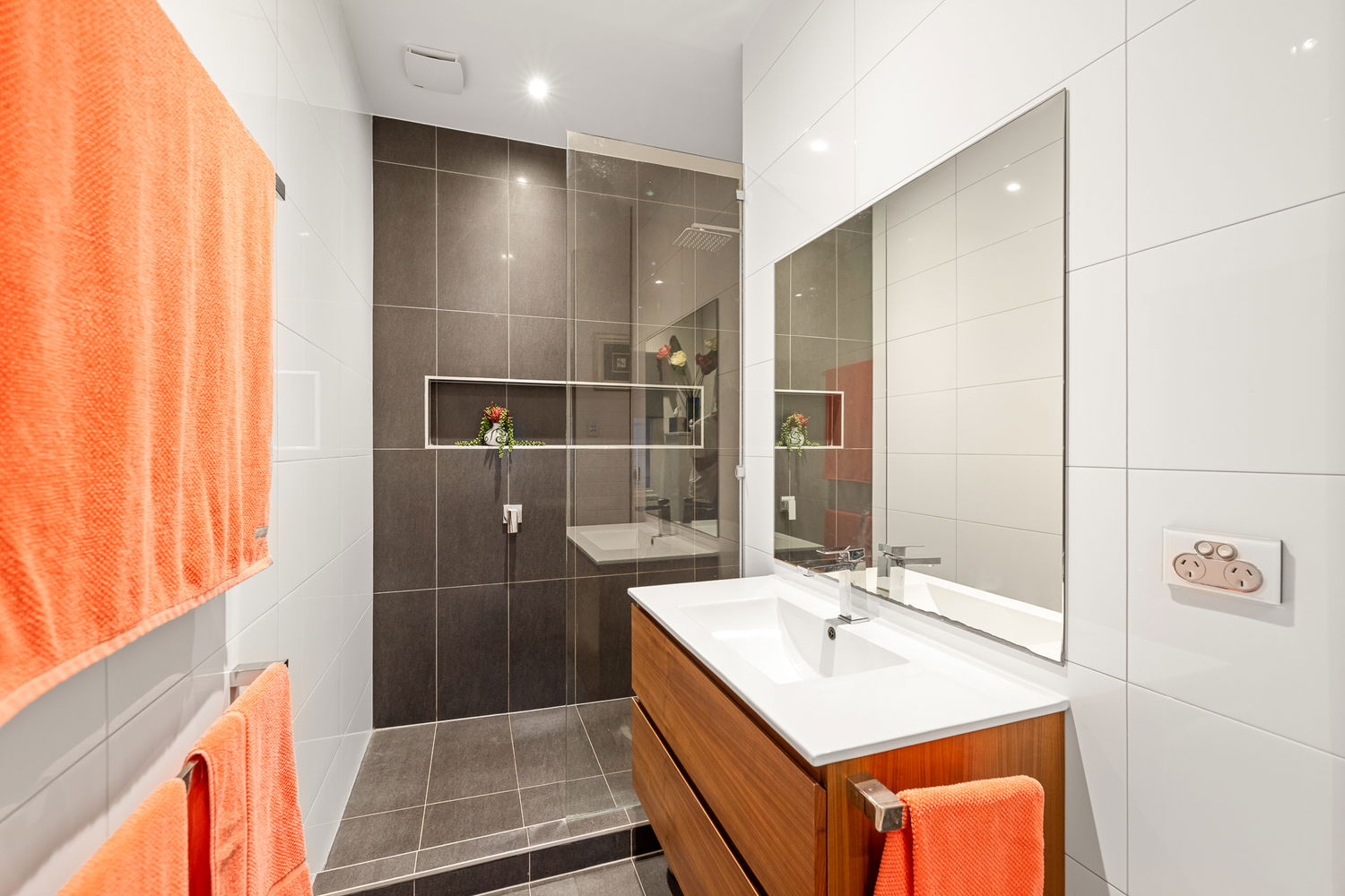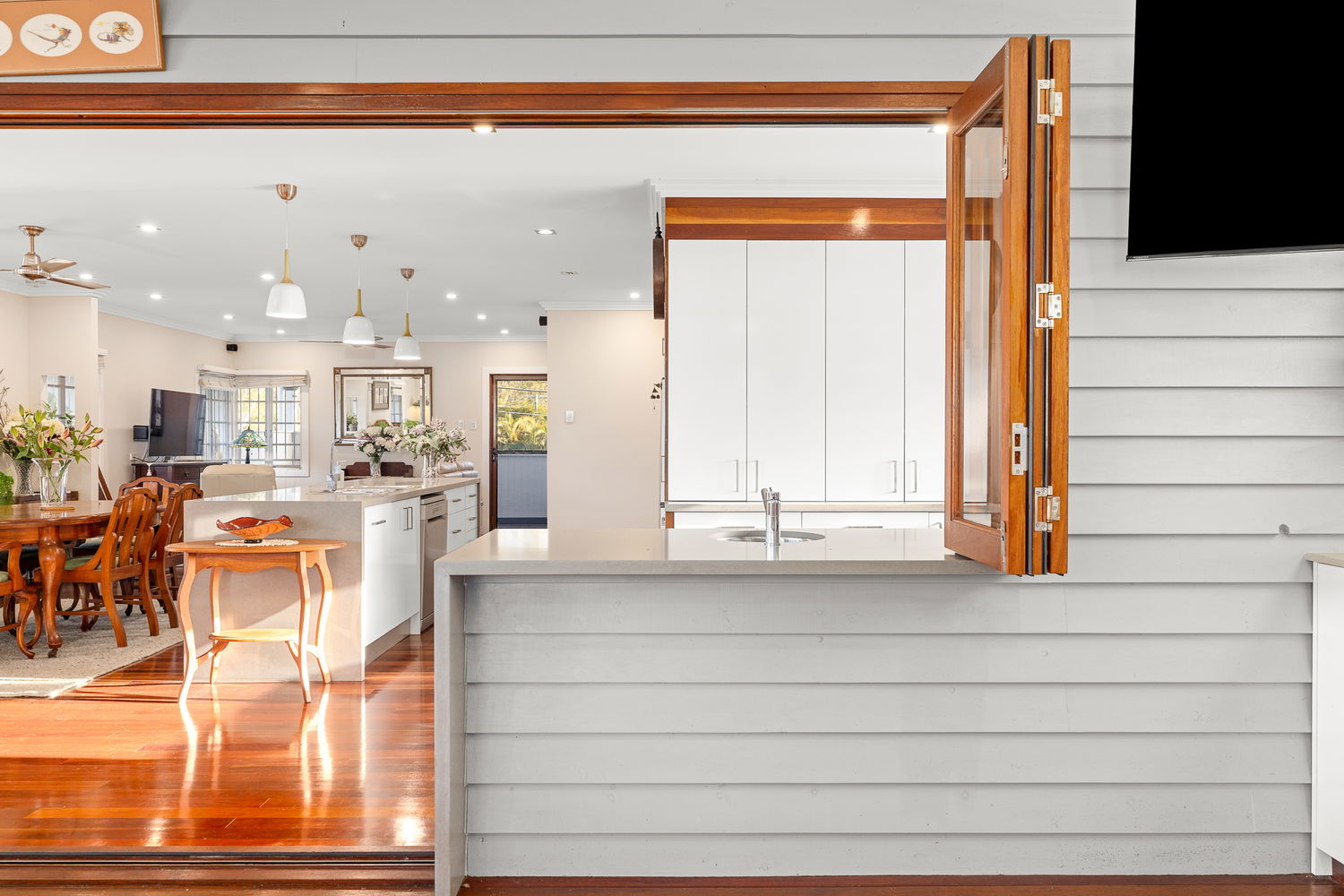 The light-filled open-plan living and dining area is anchored by a striking kitchen that features extensive bench space, modern appliances, and a butler’s kitchen. A clever servery window connects the kitchen to the deck, enhancing the home’s seamless flow when entertaining. Wide bi-fold doors open to reveal an expansive timber deck, fully screened for year-round comfort, with stairs leading directly down to the lush backyard below.