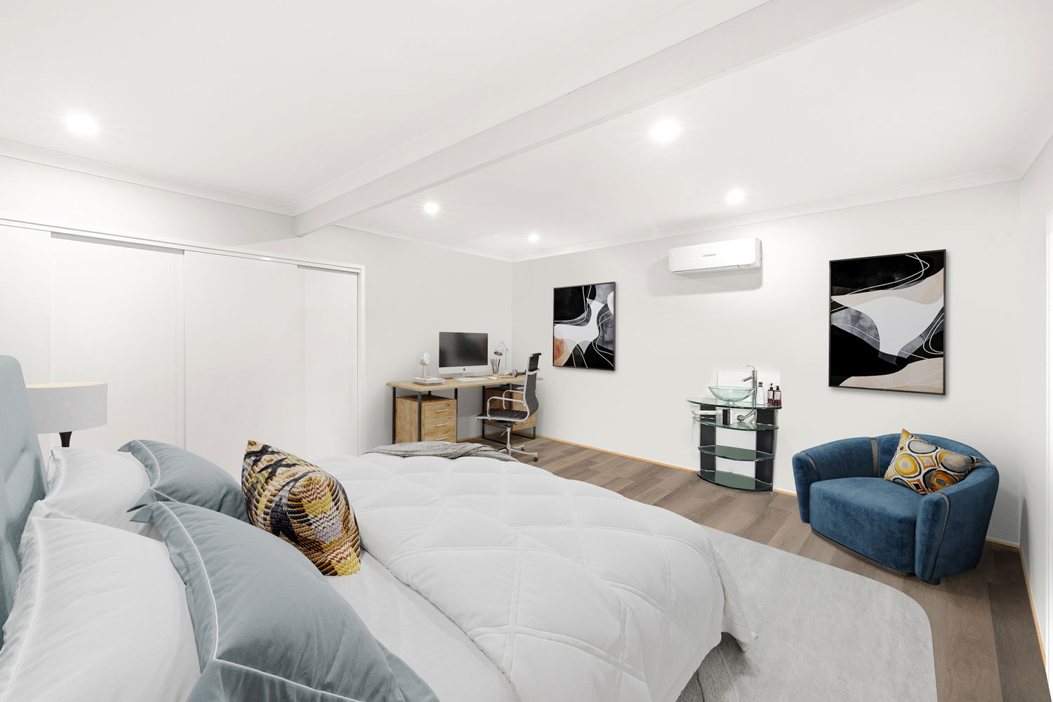 The lower level of the home has been designed with flexibility and function in mind. It offers three generous bedrooms, including a master retreat complete with a walk-in wardrobe and private ensuite. A cleverly integrated kitchenette adds convenience, while a spacious rumpus room flows directly out to a large covered patio that overlooks the manicured backyard—creating a private haven for relaxation, play, or entertaining.