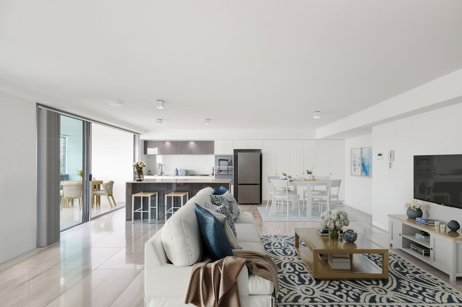 Designed with space and light in mind, the open-plan layout flows seamlessly from the contemporary kitchen through to the living and dining zones, extending onto a generous balcony ideal for entertaining or relaxing while taking in the view. The master suite enjoys direct balcony access, a walk-in robe and a beautifully appointed ensuite, while the additional bedrooms are privately positioned for comfort and flexibility.