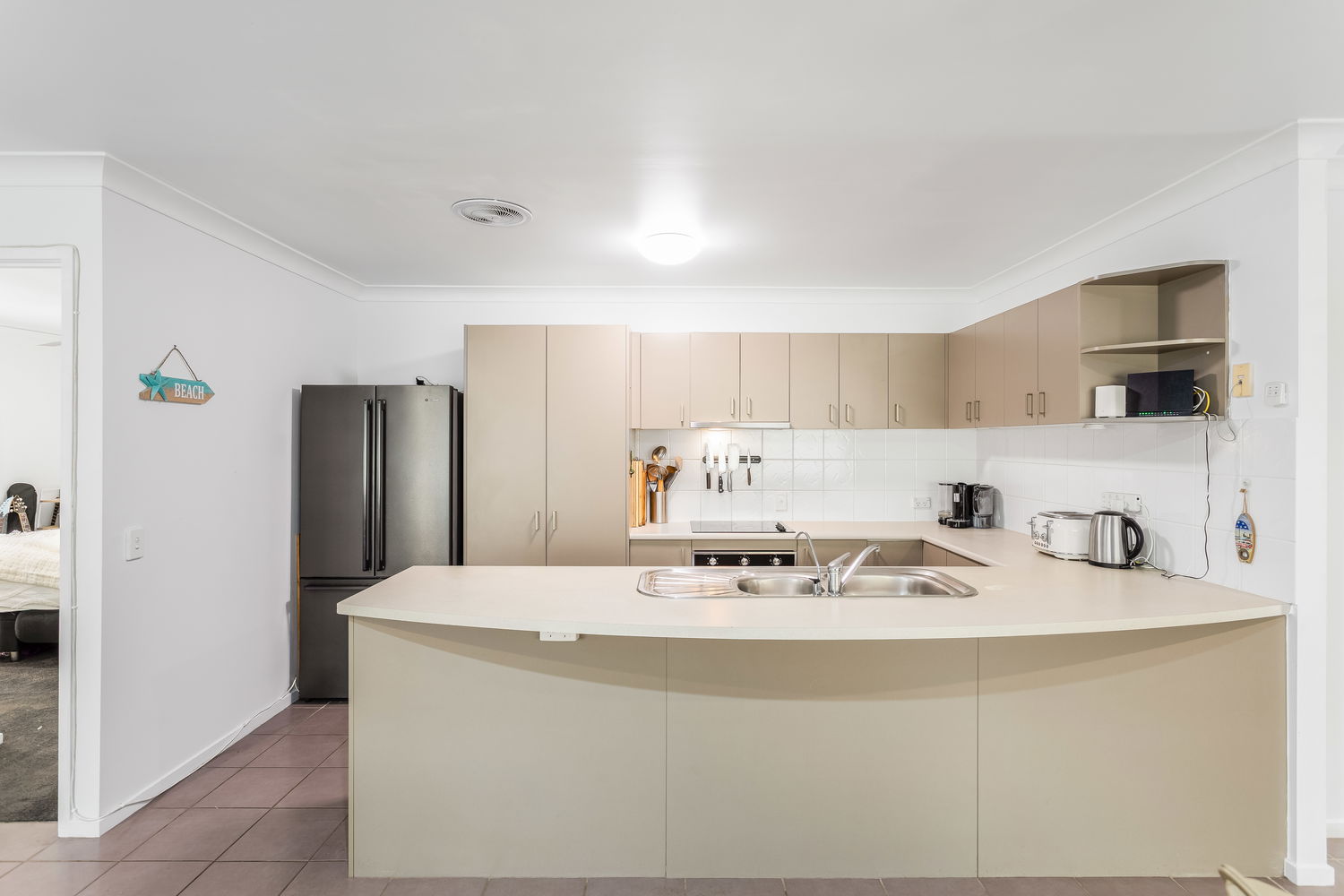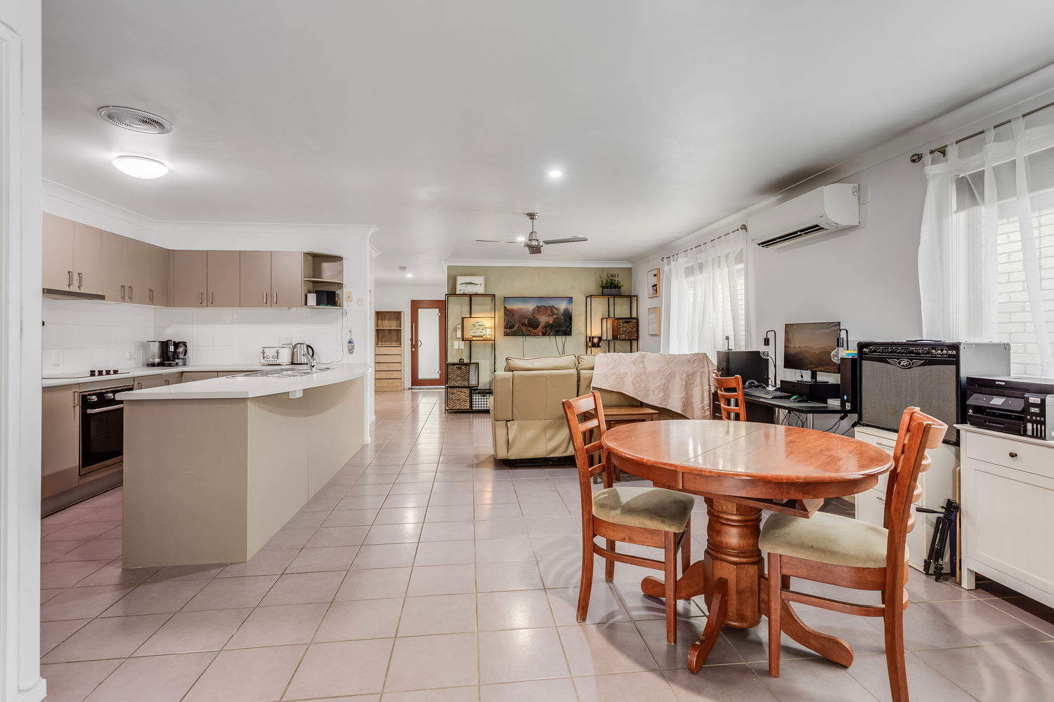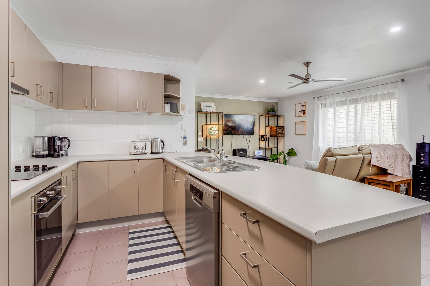 The spacious kitchen is designed for everyday practicality, featuring a double-door pantry, room for a small double-door fridge, and quality appliance upgrades including a Bosch stovetop and a near-new Westinghouse dishwasher.